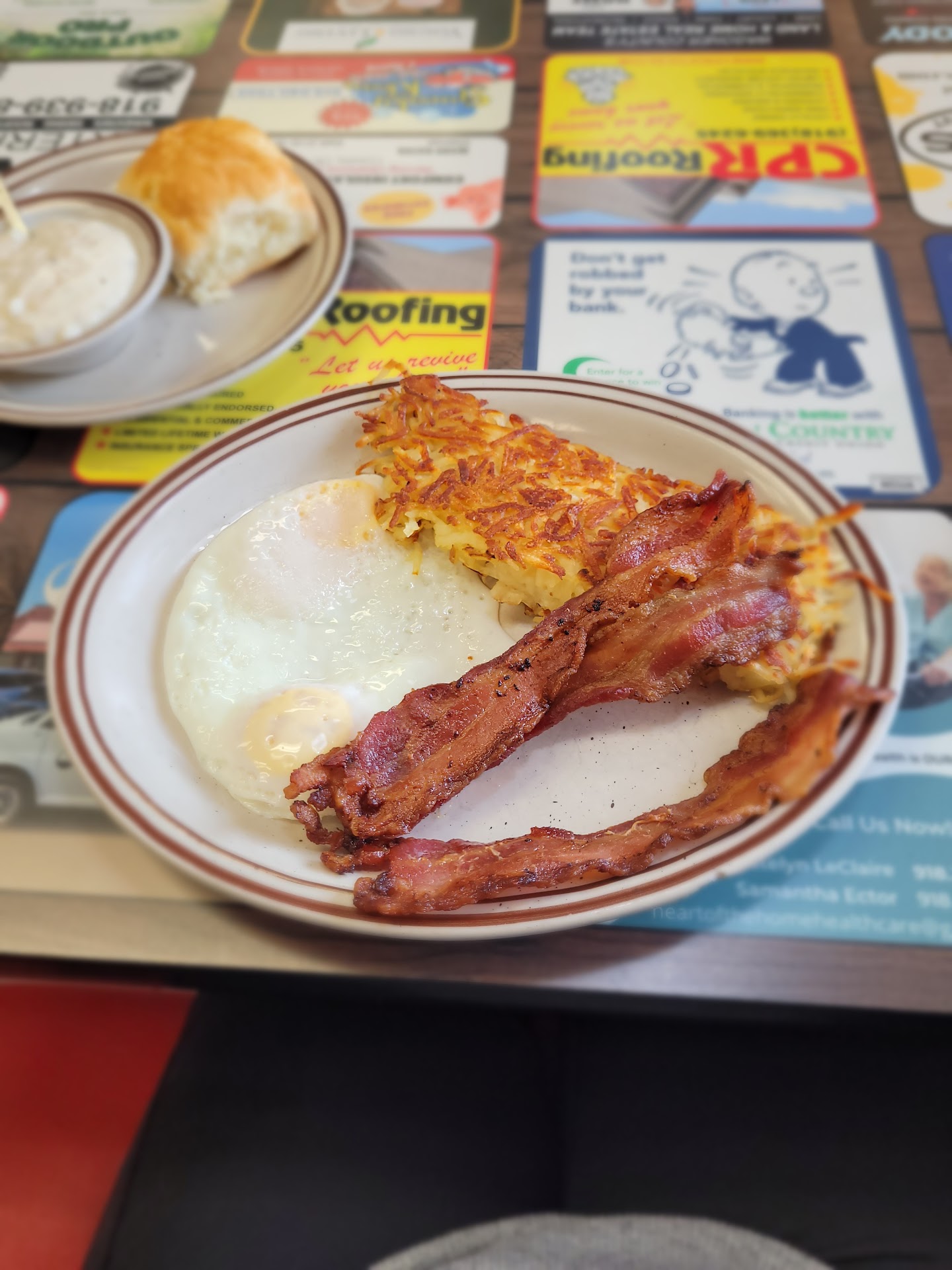 Read moreFinally made it in for breakfast (I'm not a regular breakfast eater) and I'm glad I did! The place was clean, a little busy, but oh my word, what great staff! I was greeted and seated right away. A server took my order pretty quickly, and my meal was in front of me in a very short amount of time! I ordered a basic two eggs over medium, bacon, hash browns, and a biscuit with gravy. The eggs were perfectly prepared, runny yolk, firm white, the hash browns had a nice crispness, the bacon was cooked just right - not burnt to a crisp, but also not rubbery, and the biscuit was light and fluffy, the sausage gravy in a separate bowl so I could use as little or as much of it as I wanted. While sitting there enjoying my meal, I noticed several couples came and went who are obviously "regulars"; they were greeted with warm hugs from the servers, and a flurry of quick conversations "catching up" took place. (The rest of the customers were never neglected, btw.) The pie case was full of delicious-looking slices of pie - I will have to go back just to try some! The total bill for my meal (before tip) came to $11.92 - all in all a reasonable price for a...