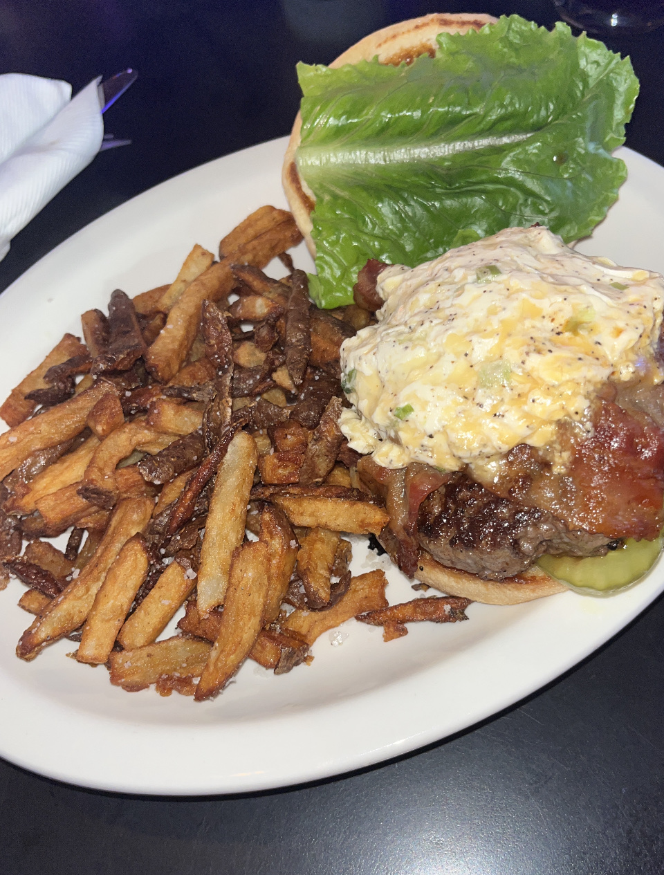 We ordered the Smokehouse Burger $11 which in my opinion could hang with the higher price locations. Very well cooked and seasoned. I like the cream cheese mozzarella mix. Fries were crisp.