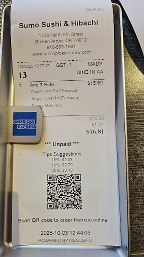 In order to get a broad sample, I went with the 3 roll lunch special. I cross checked the menu to see what I was getting, which was the Tootsy Maki, Miami Heat and Angry Tuna rolls. I didn't pay as close attention as I should have ,as it turned out the Miami Heat and Angry Tuna rolls are pretty much the same thing. Be that as it may, my order arrived in pretty short order and to be honest, it looked outstanding. And that's where the wheels flew off the bus, at least for me. All three rolls were bland and almost devoid of flavor. At one point I started deconstructing a couple of pieces to see what was going on, and there was no flavor of any substance in any of the elements. The crab salad filler was warm and had hardly any flavor at all. The tempura didn't add anything to the rolls except making them harder to eat. Even the spicy mayo was bland. Looking back, I'm not totally convinced that I didn't get two if the Miami Heat rolls, because they seemed pretty much the same. All that said, I'm sure their food is generally regarded as good by other people, given their aforementioned ratings, but for me, it completely missed the mark. Again, I'm not saying it was bad, but if I lined up all the sushi places I've been to, Sumo would not be in the top 10. Total damages before tip was...