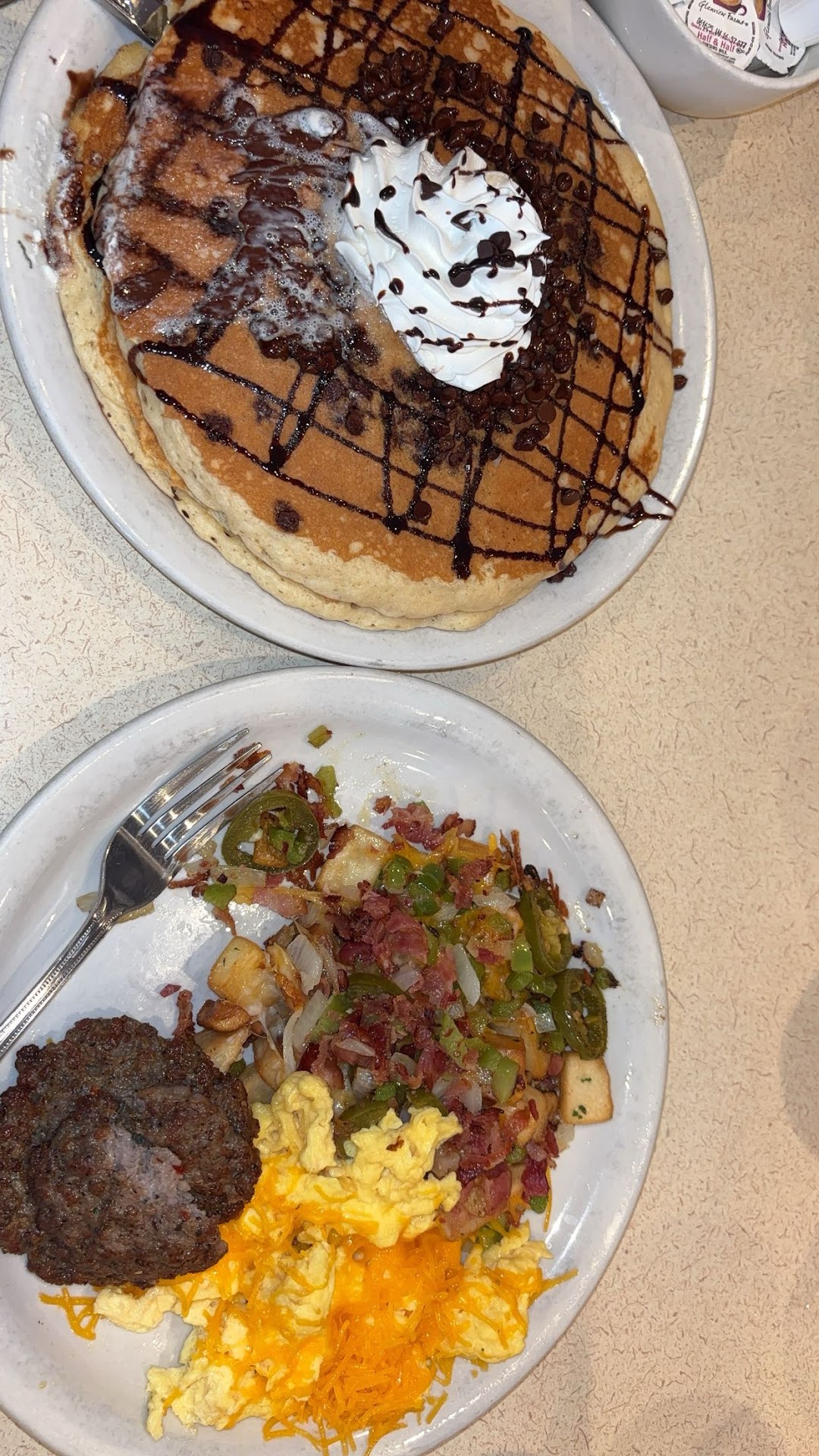 She brought us each our own pot of coffee after seeing us play fighting over the last cup. She seemed to be one of many servers running back and forth attending to many customers. It was rather impressive to see her manage everything and with such ease. I forgot to mention the several plates she had perfectly stacked all the way up her arm when she delivered the food. That's talent if you ask me.