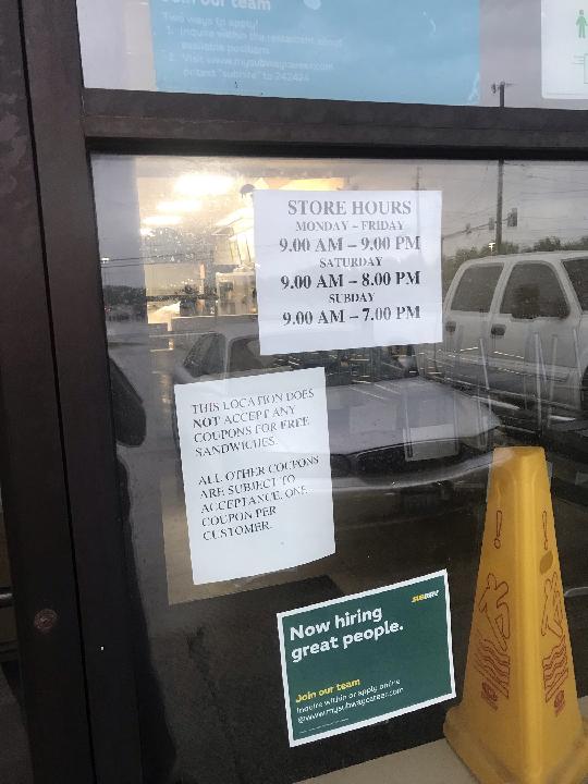 I don’t do reviews but I got a foot long tuna sandwich had a coupon n I ask can she put little more cheese she said no cus I had a coupon then as I looked closely at my sandwich it wasn’t even enough tuna on the sandwich to even spade on there I also had another sandwich I think she was been funny n put lil bite of cheese on there n lots of miracle whip and sweet onion sauce but little does she know that’s how My Son likes a lot of miracles whip n Sweet onion sauce on his sandwich but she didn’t even ask if I wanted a lot tho poor service I will not be back there !!!!!!!!!!!!!!!!!!! If you don’t want to do coupons at your store...