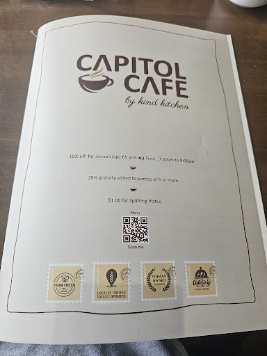 Read moreCapitol Cafe what happened? We have been coming here for years. Food was always good, service friendly. Staff got to know my kids... Came tonight on a Thursday at 6pm. Server was friendly and was training a second server. My husband ordered a sandwich, kids ordered a hamburger and pancakes, I ordered a salad. We waited over 45 minutes for our food after it was ordered. My husband said his sandwich was dry. My kids didn't complain about the food. I started to eat my salad and found a big, dead fly in it. My husband told the woman working at the register. She came over and rudely asked what was in my salad, however, she did seem embarrassed and apologized when I showed her the dead fly. She asked if I wanted anything else and offered to take the salad off the bill when I said i did not want anything else. I also had to swat a few flies away from the table while I was eating. The restaurant just didn't seem to have the same friendly vibe we are used to, plus the food wasn't very good, and there was a dead bug in mine. Things didn't seem as clean, the decor on the walls really needs to be scrubbed down as there were food stains on the decorations and the blinds are literally filthy. The kids booster seats are in need of a good wipe down, too. Hate to give a bad review to a place we have been frequenting for years, but it is obvious that there is new staff and things are getting...