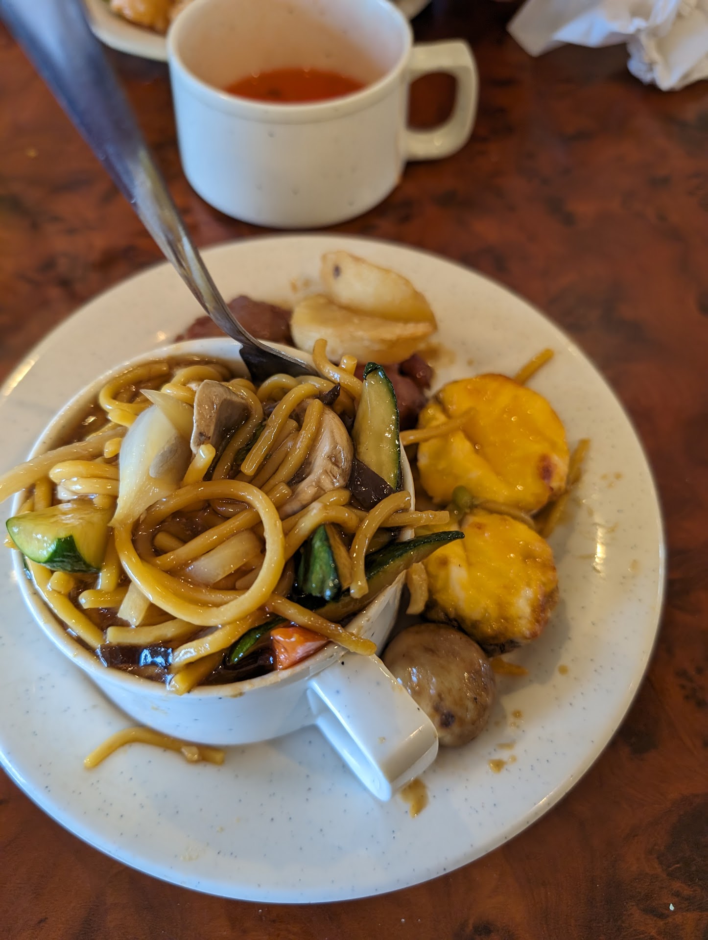 2 things that stood out to me were no veggies by themselves other than salad. You have to get the veggies out the mushroom beef or chicken and broccoli. You could easily use the spot were the crab bake was supposed to be. The other was the salad dressing. You only got ranch that's it. And it's warm. They had other sauces but ones that didn't make sense. Duck sauce no duck Dumpling sauce no dumpling. Hot mustard and tartar sauce no fish. Cocktail sauce for the cold shrimp...