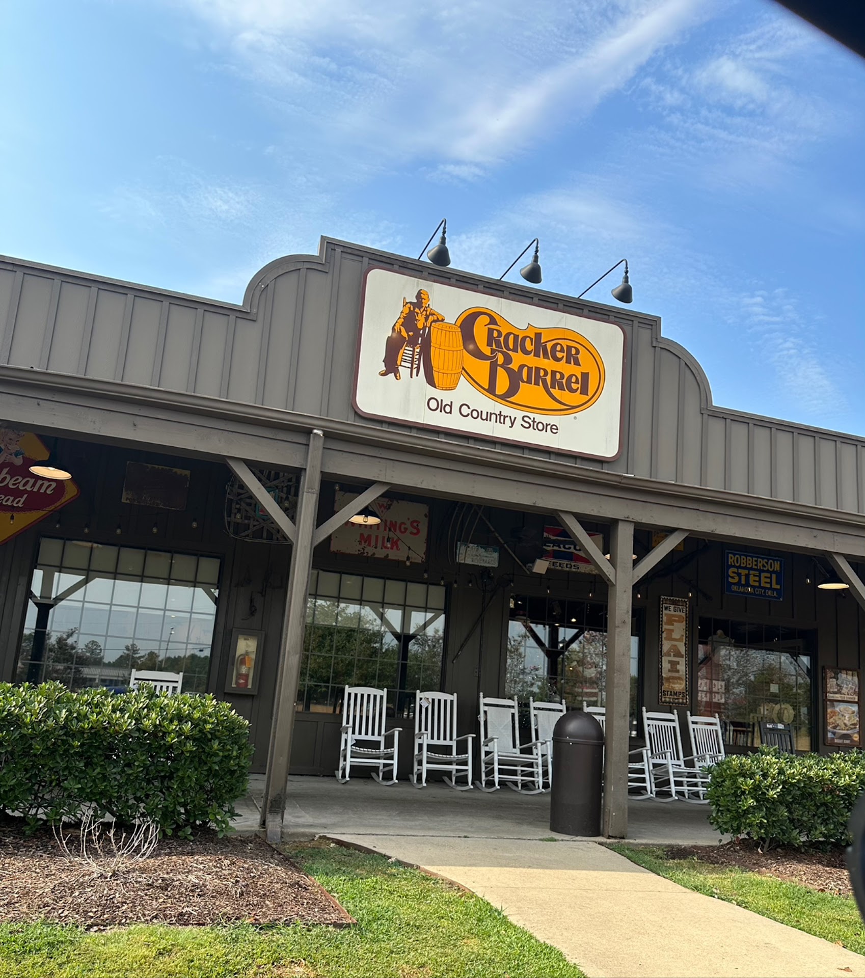 The worst Cracker Barrel I've been to, ever! We walked in and were seated in a strange spot (no other customers in the room but us and one other table, we desired a little space). Asked to move to a different table and that's where it seemed to start with eye rolls and snotty attitudes. The music was loud and our waitress was hard to hear. The restaurant was out of salad dressing we wanted, disappointing but okay. Then when food arrived we were told that there were no biscuits, no baked apples, and they didn't cook the chicken pieces that were ordered. Then the waitress brought other tables the bread and we had to ask for ours. We waited for the correct chicken for an extra 15+ minutes. Our waitress gave back scratches and rubs to other customers (it's okay, I don't want one, but it would have been nice to have bread and a drink refills). The mashed potatoes had a dried layer on top as if they had been sitting under a lamp for an extended period, the waitress offered me another helping but I said no since I didn't want the same thing and they were out of the other things I would have wanted. Okra and chicken were overcooked. The best thing about the meal was the breaded fish fillets. Anytime we talked to the waitress she rolled her eyes and sighed with big attitude. After we told her about our problems she shrugged, sighed, rolled her eyes, and then never came back to check on us at all. This was literally the worst Cracker Barrel we have ever experienced. The managers were told about our experience, they (James and Brittany) took care of our bill and were exceptionally helpful and friendly. Maybe we will try again if we come back...