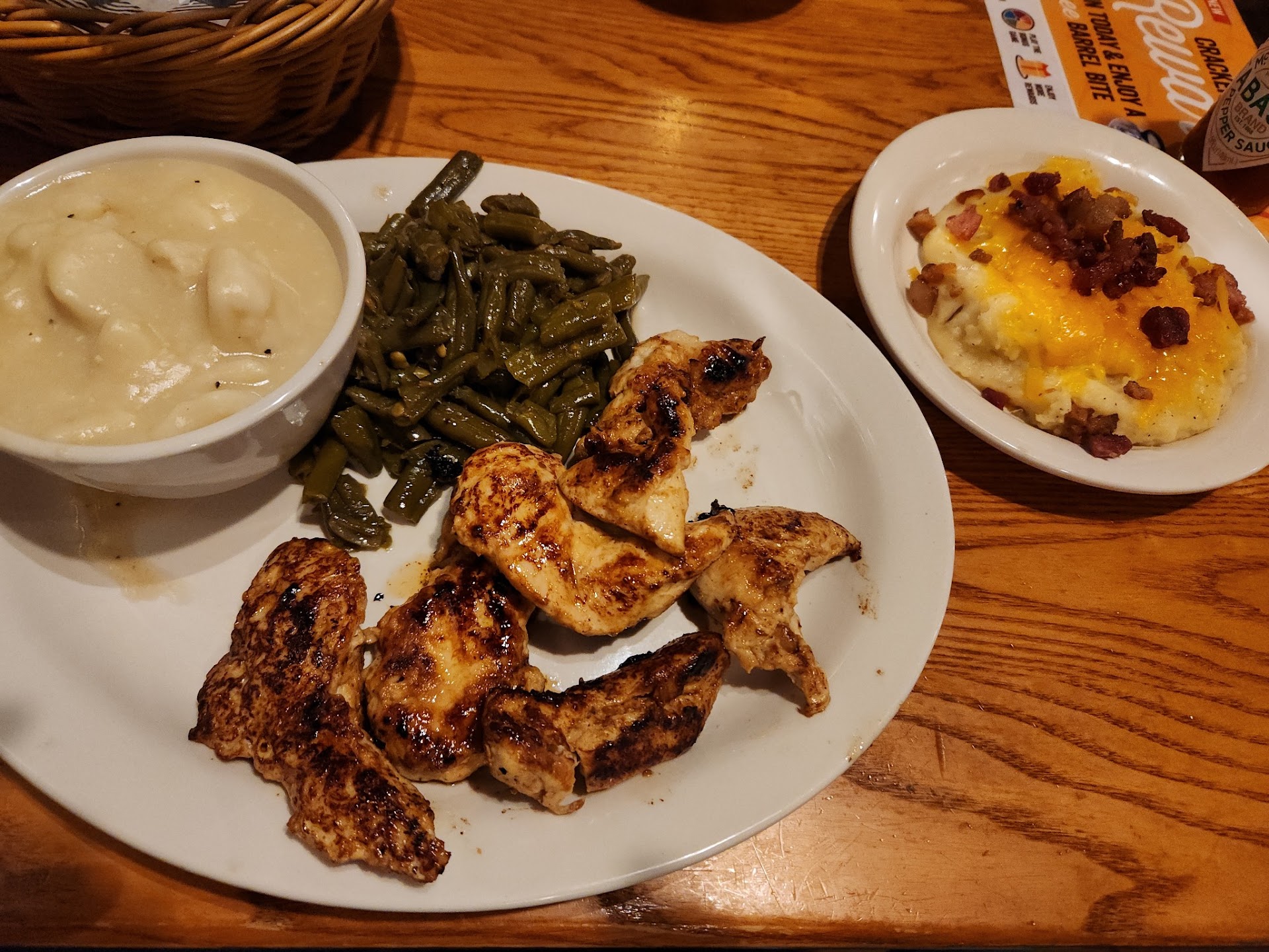Ā Ā Ā Read moreThe service was extremely slow. The time it took for someone to greet us with menus was a little longer than expected but not a big deal. However once our drink and food order was taken thats wheb the ridiculous waiting periods begin. The servicer came out with our drinks (party of 2) about 10 minutes later. Silly me once the drinks came I asked for another drinks. I received that about 10 minuter. After sitting there for about 25 minutes after we had already ordered our food, I asked if we would be getting biscuits. (If you have never been to Cracker Barrel or any other restaurant where bread is served, the bread is brought out with the drinks) After another 15 minutes the food order came out WITH the biscuits. Maybe if the biscuits were brought out earlier with the drinks thereās a possibility I would not have noticed how long all of this was actually taking. I should mention that our food and biscuits werenāt given to us by our server. The biscuits were hot but the food wasnāt. It was warm at best. After waiting so long I dare not send it back. At this point our drinks needed refills but the server didn't come to check on us until about 20 minutes after we received our food. I asked for more biscuits and two refills. She looked puzzled but I didnāt know when we would see her again and I wasnāt taking any chances. After all we havenāt seen her in 35 minutes. Our glasses were empty when we received our food 20 minutes ago. This time she did come back in just a couple of minutes. This is by far the slowest service Iāve received at any Cracker Barrel....