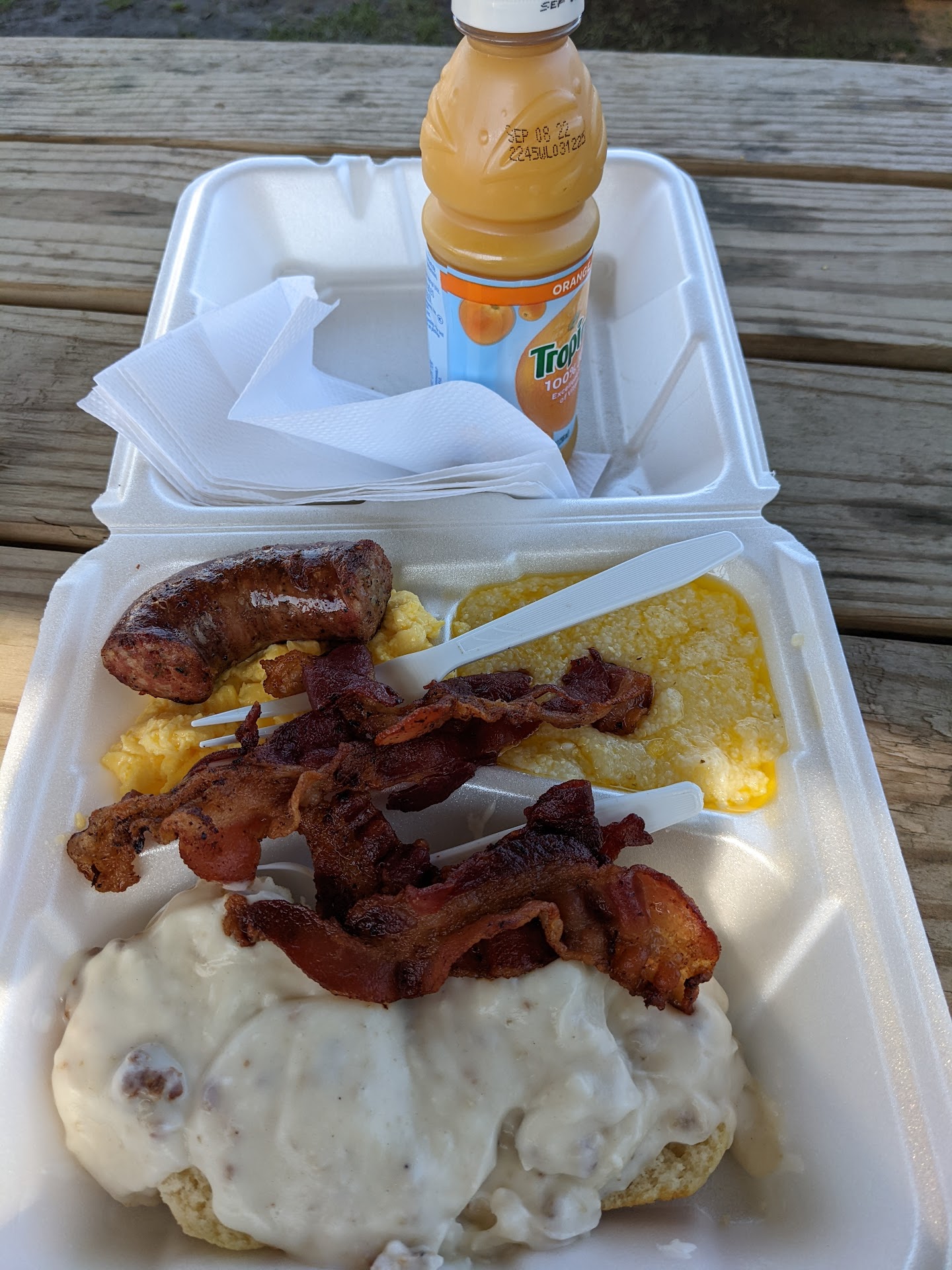 This location is basically drive-thru only. A very small location that has no dine-in option. It has two picnic tables outside, but it seems to be the happening place as the drive-thru had a consistent flow of customers. The eggs taste like they might come out of a carton rather than a chicken. The bacon was delicious, you get one biscuit, some grits, and a large soda for about $8.50. From appearances, the staff has their jobs down to a science as you do not have to wait very long to get your breakfast. Being a first-time visitor, I didn't get to sample a lot of the menu, but with the consistent flow of traffic, the food appears to be pretty good. If you want to eat here, their hours are from 4:00...