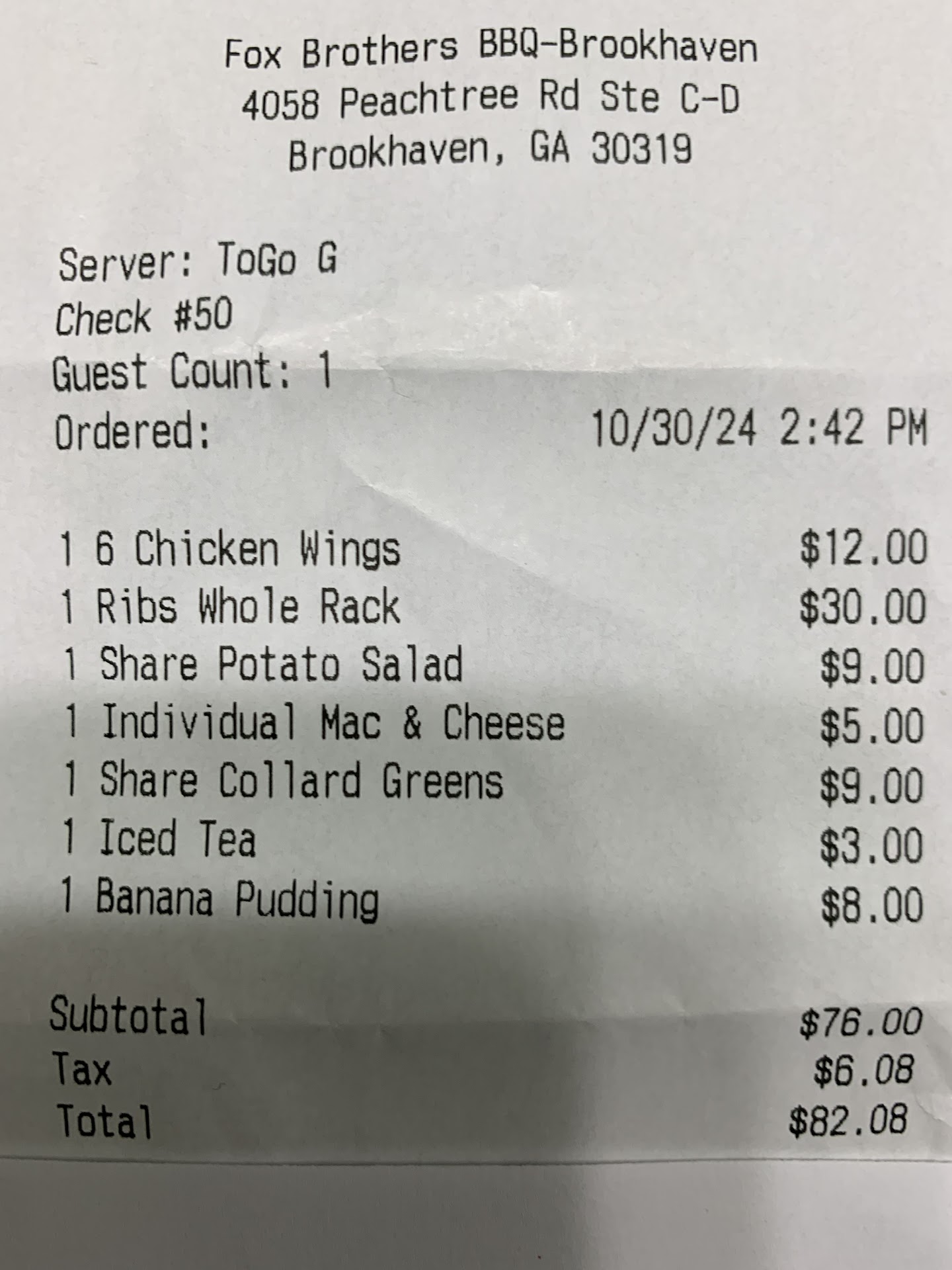Read moreI normally go to Fox Brothers barbecue, DeKalb Avenue so I decided to try the one in Brookhaven and to my surprise they did not measure up to the Dekalb Avenue Location so far off, I got my order to go and upon getting home and having dinner the food was extremely horrible, Potato Salad had to much seasoning, salt and etc., same for Collard Greens, Mac & Cheese was sticky and definitely not sure of the flavor there was none no Cheese consistency or was it just the wrong type of cheese, Banana Pudding had only 3 banana slices, The Ribs were very salty and the taste I’m used to from the Dekalb Location and the Wings were OK. When I called and spoke with a manager he tried to explain how they do their seasoning, I totally didn’t understand, but in my opinion, everything was terribly seasoned, and the banana pudding he stated that they separated, so it’s only three banana slices in each order of the banana pudding so if you want some decent banana pudding, don’t get that one. As a manager he ask me what he could do that’s not a question for he should have had a solution to this problem. I Pray that they didn’t franchise their store. I will not be going there again,...