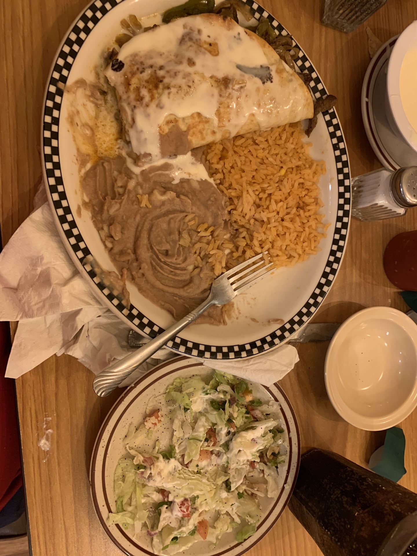 "Steak" fajitas. The meat was not skirt steak. Instead the steak was cut into weird thin little strips. No sear or char at all, just grey and soggy and bland. The onions and peppers were also soggy, no char, no evidence that it had been anywhere near a grill. The plate wasn't sizzling and the food wasn't even hot. Obviously everything was cooked ahead of time.