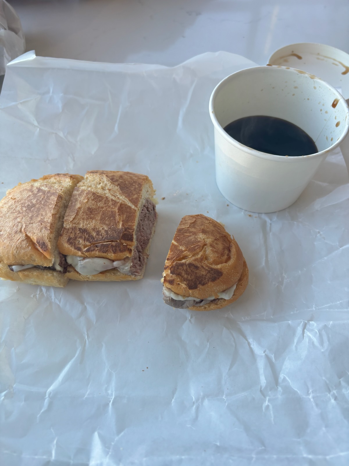 Food: The prices are reasonable. My husband got the French dip and complained a bit about the size being pretty small for the price, but we both got sandwiches and coffees for $30; which is about right in these post-COVID times. My sandwich was a ham, egg and cheese croissant- it was good, but the ham was VERY salty. The coffee is good, husband says it’s “mid”, completely unremarkable (he drinks it black). I got a white mocha and mine is quite delightful- I forgot to ask for half sugar, something I’ve had to do at most restaurants recently, but I actually don’t need that here because it’s not sickly sweet. Big plus there.