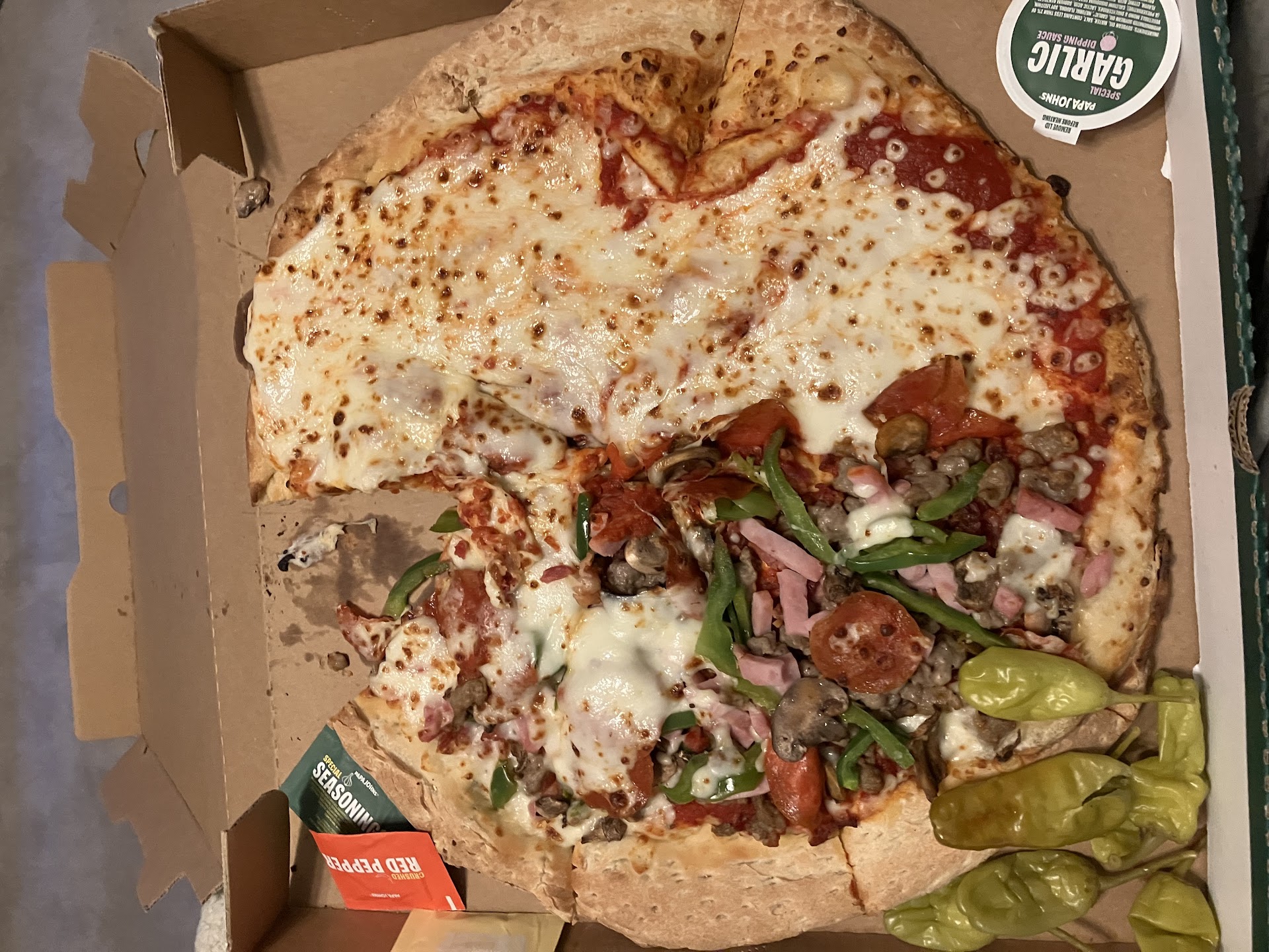 However, our recent experience on May 17th, around 6:30 PM, fell far short of expectations. We ordered through the app and picked up the pizza ourselves. Unfortunately, upon opening the box, we were incredibly disappointed by the appearance of the pizza and Papadias. It was far from the usual Papa John's quality we've come to expect. We tried to eat it, but both the pizza and Papadias lacked the freshness and taste we usually enjoy.