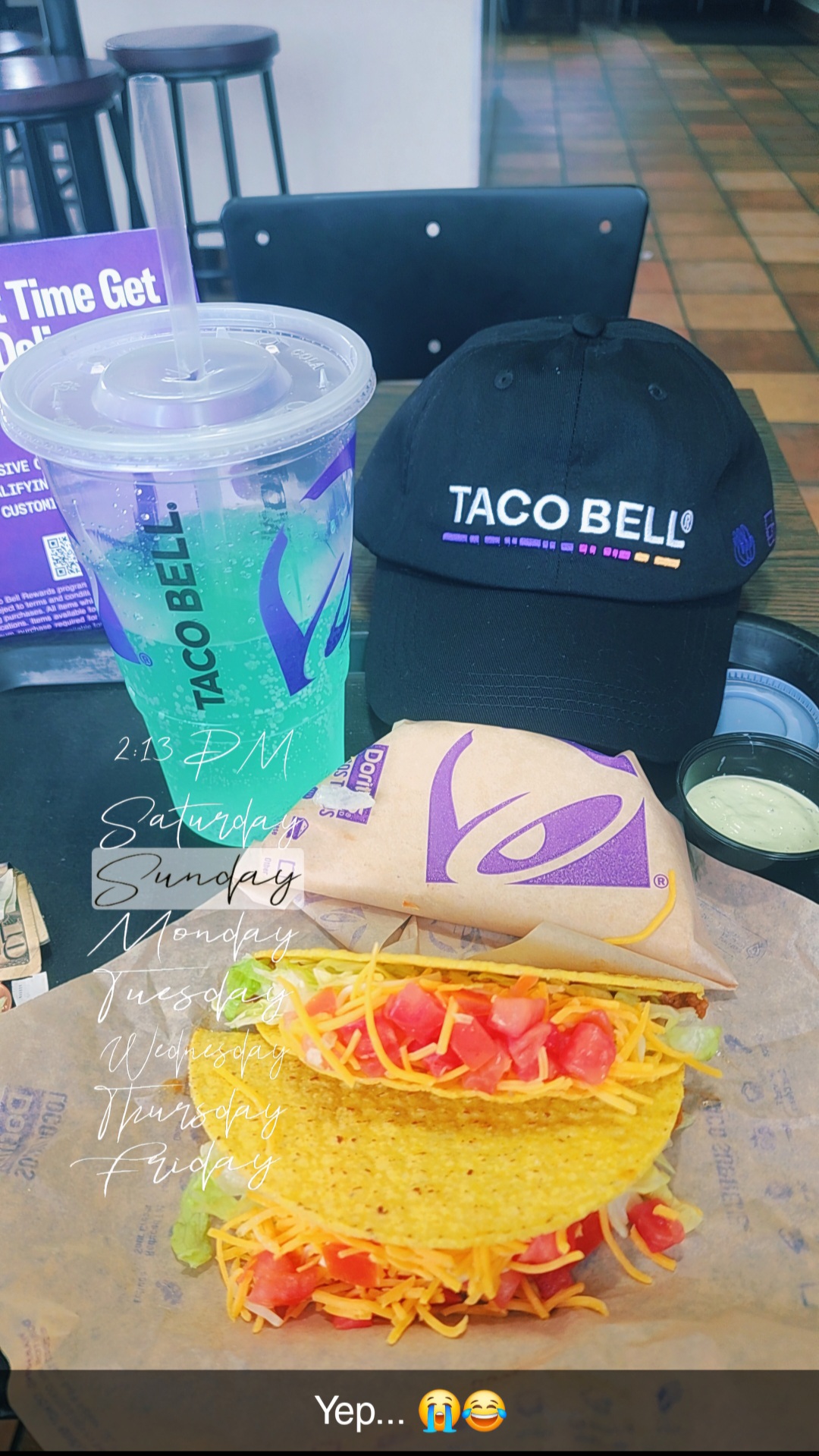 ย ย ย Read moreTaco Bell has a $5 meal right now...in a box, plus your medium drink comes with it. Great deal for anyone on a budget, or a family with many mouths to feed! The meal comes with a chalupa (your choice of beef, chicken, or steak..steak cost a little more)a taco, and your choice of cinnamon twist, or nachos and cheese dip. It's definitely plenty to eat! And drink if you eat in, refill on drinks are free. I have only one minor complaint about the food...my taste buds require mild seasoning. The cheese sauce that was on my chalupa was the limit of "heat" that I can tolerate! I'm in the minority...most of my friends and family can tolerate much hotter. It Was seasoned very well, though and was otherwise very delicious! One other thing, not so good...the table tops needed cleaning off. This was not normal, usually the tables and chairs are always very clean! We chose the cleanest one and wiped it off ourselves. My guess is they must have been so busy with custmers that they simply got a little behind; because I never recall the tables not being clean,"as a whistle" in past. I don't hold that minor in faction against them. I will definitely go back soon and I recommend this place to parents with children,as it saves you money and the food...