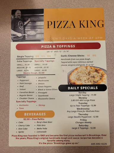 Read moreThere are 3 pizzas in the area that I crave. Tomacelli's in Sioux Falls. Dar's in Pipestone and Pizza King, Brookings. I live in Sioux Falls. I drive to Brookings just to pick up a par baked pizza and bring it home to serve the family. When I lived in Brookings in the Mid 80's to early 90's you chose one side of the street or the other for your pizza choices. That choice told me really all I needed to know about you. Me and mine; we were East side of the Street Pizza people and West side of the street drinkers (Jim's Tap). Stop in. Grab a pie. Take a couple home. You'll be...