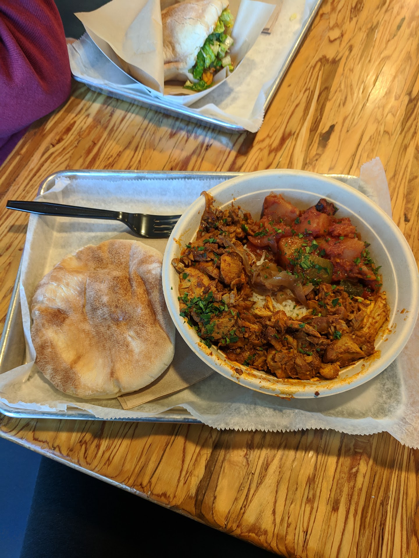 Read moreI really enjoyed my meal here! I had been wanting to try this place ever since it opened, and finally got around to going today around lunch time. I'm so glad I did! They had 3 options for how you wanted your meal. First you pick your protein and then you get to choose to either have it packed in the pita bread, have it in a bowl with rice and veggies, or have it tossed in a salad. They recommended the pita bread but I decided I wanted chicken in a bowl with the rice. It came in a big serving with the pita bread on the side. I thought my meal was delicious and will definitely be going back. The atmosphere was really nice as well! They have two counters to order from. One is for the food, and the other is for coffee/smoothes/etc. The service was fantastic as well. We were greeted when we came in the door, had the different options explained to us, and they even brought us cups of water to our table, which was supposed to be self serve, and it was very nice of them! The owner came out and seemed to make it a point to talk to every customer to make sure they were enjoying their meals. Overall: food was delicious, atmosphere was very nice, and the service was fantastic. I will definitely...