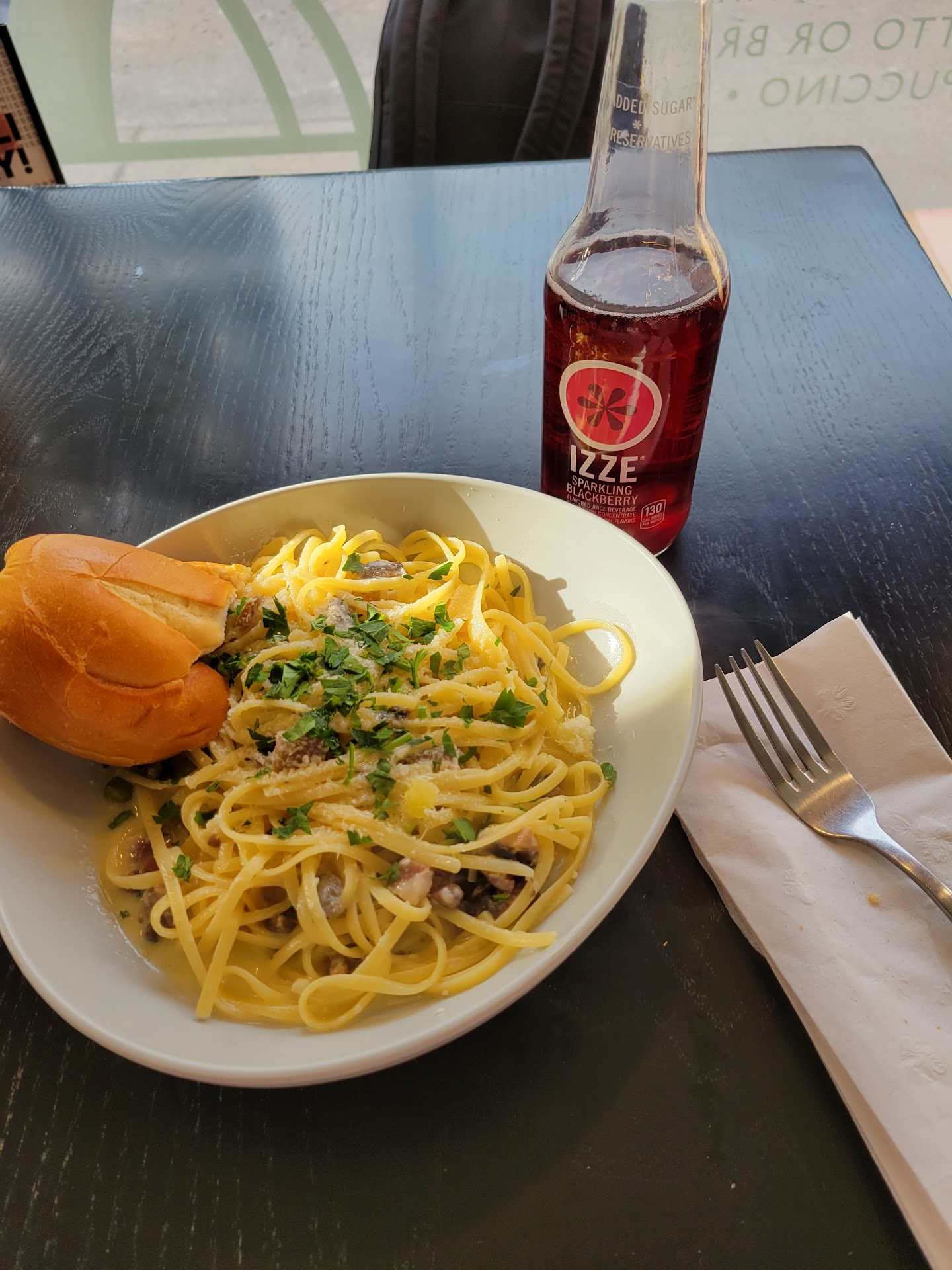 The atmosphere is nice, sort of pain jane with some window seating and a big wooden picnic table in the middle. They also sell bread, baked goods, salads/pastas in a refrigerated case, and italian products (pasta, beans, canned tomatoes).