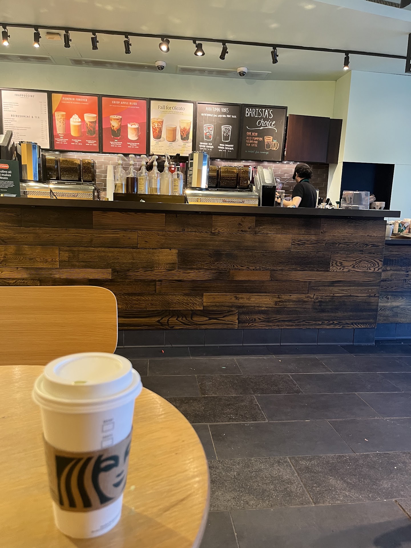 Read moreCoffee is always good. Professional workers. Pricey-it’s a Starbucks. Not a full menu *$ as they don’t carry sandwiches, or wraps &c. They have pastries and those egg things. A condition of their lease at the Shops at Putterham as I heard. I’m in favor of David v. Goliath, but I don’t think other stores offer breakfast sandwiches that *$ competes with. Maybe the addiction store has sandwiches (convenience store: tobacco and lottery)