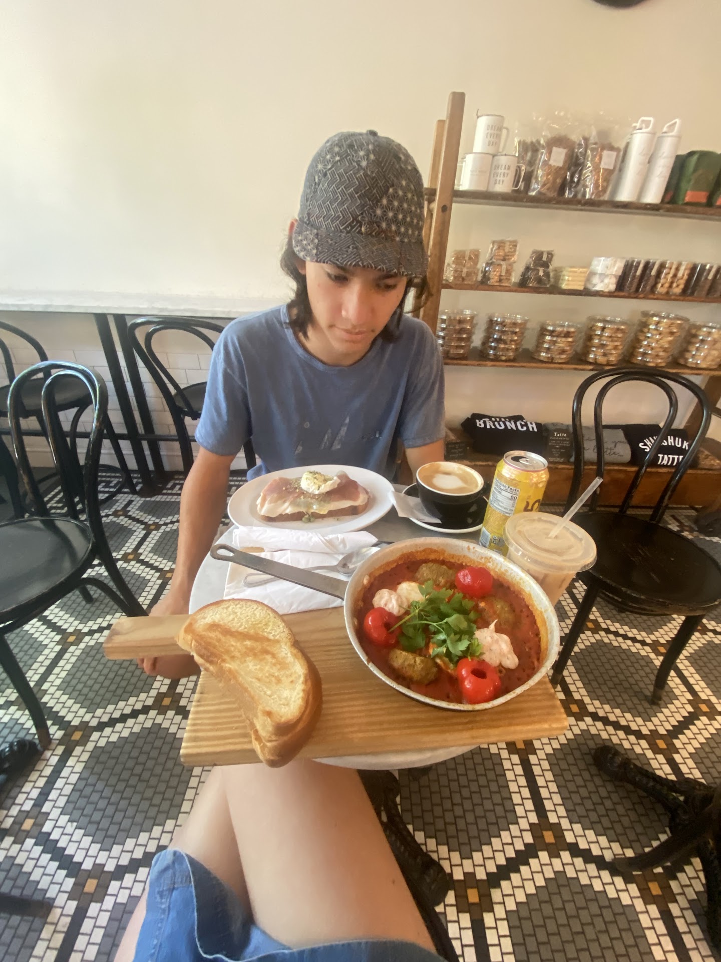 Food here is good enough. Some eggs were overcooked. The shakshuka had one medium and one poached egg. Do not order prosciutto and pea tartine: you will be disappointed. It was severely unbalanced: not enough salt or acid. The Halumi crunch salad was just barely not good enough. It felt like it had been sitting in dressing for a too long and the cheese wasn’t actually crisp or crunchy.