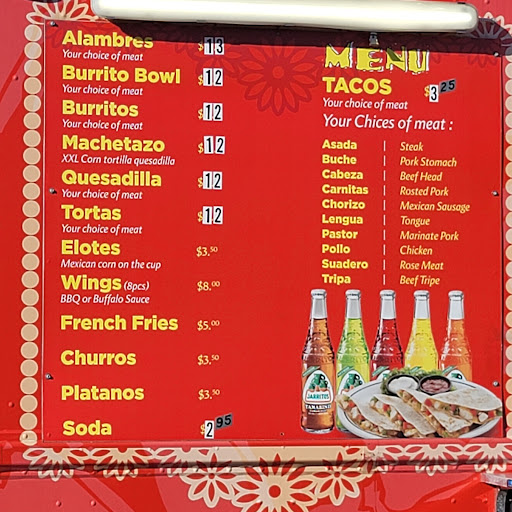 Read moreThis was my first time eating at this food truck. My brother and I tried the burritos (chorizo and Pastor), Pollo Quesadilla, tacos (carnitas and asada)....in addition they gave us some free churros to try!!! Overall it was pretty tasty. When I go back my focus will be on asada tacos (those were the best out of everything...but they are $3.25 each)...and I'd like to try elotes (which I regret not trying this trip). If you're in the area of Central Ave in Columbia Heights...and have a hankering for tacos....I'd definitely stop here...it's quick and tasty. The only downside is...the prices have gone up and there's no where to sit as it is in a parking lot. We just brought our own drinks to save on the cost as well. After getting our meal we drove to a nearby park and just ate in the car...but this food truck is definitely worth checking out....as well as grabbing some of those...
