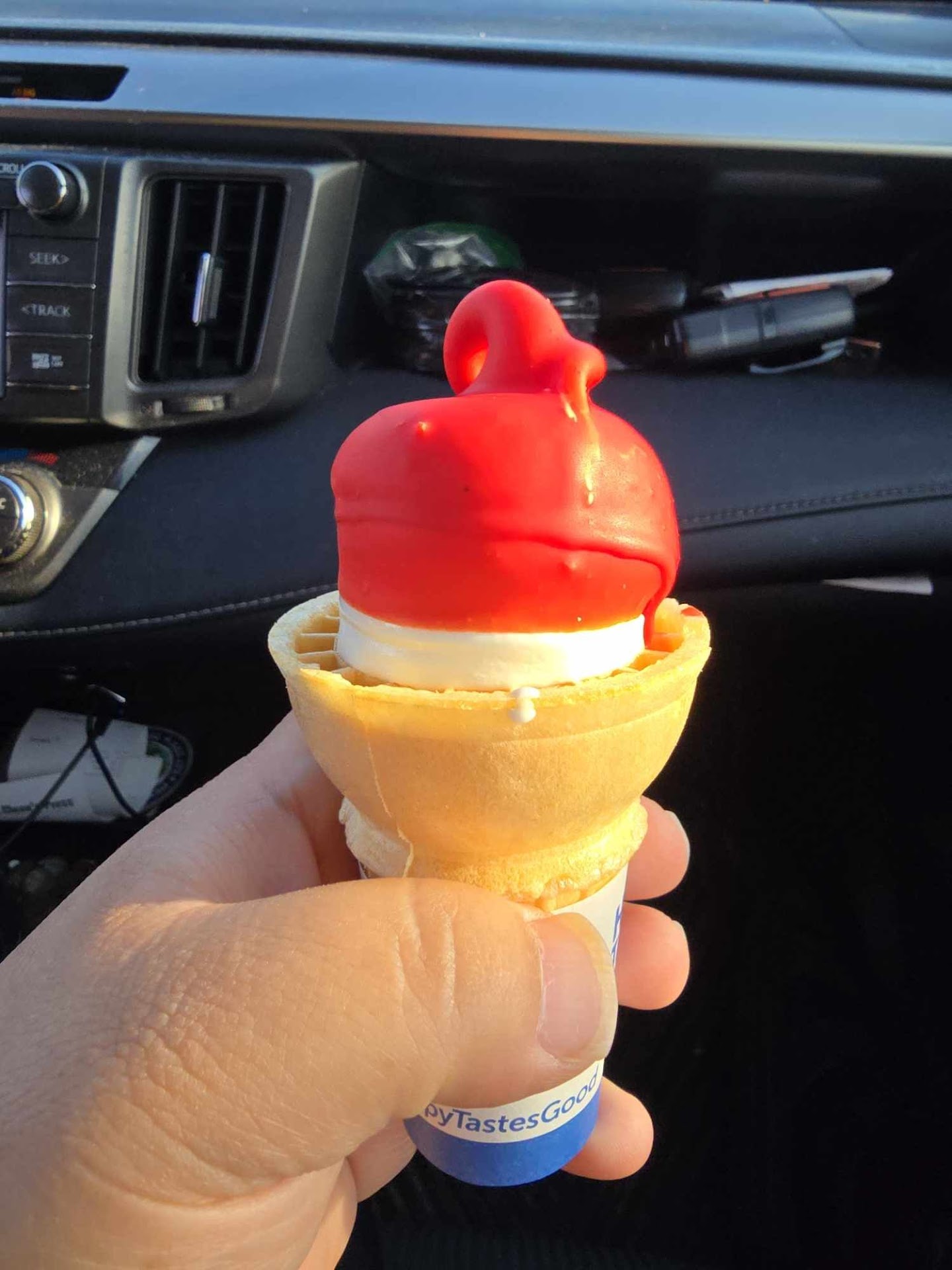 That was a stupid question. They ran out of cones! Not all the cones of course, but they couldn't possibly have made a free sized cone in a larger cone. They must not have known that DQ free cone day was coming. International Dairy Queen perhaps should have done a better job communicating that it was going to be free cone day. On the other hand, the dozens of other potential patrons that came and went in the brief time I was there would suggest that communication about the event was adequate.