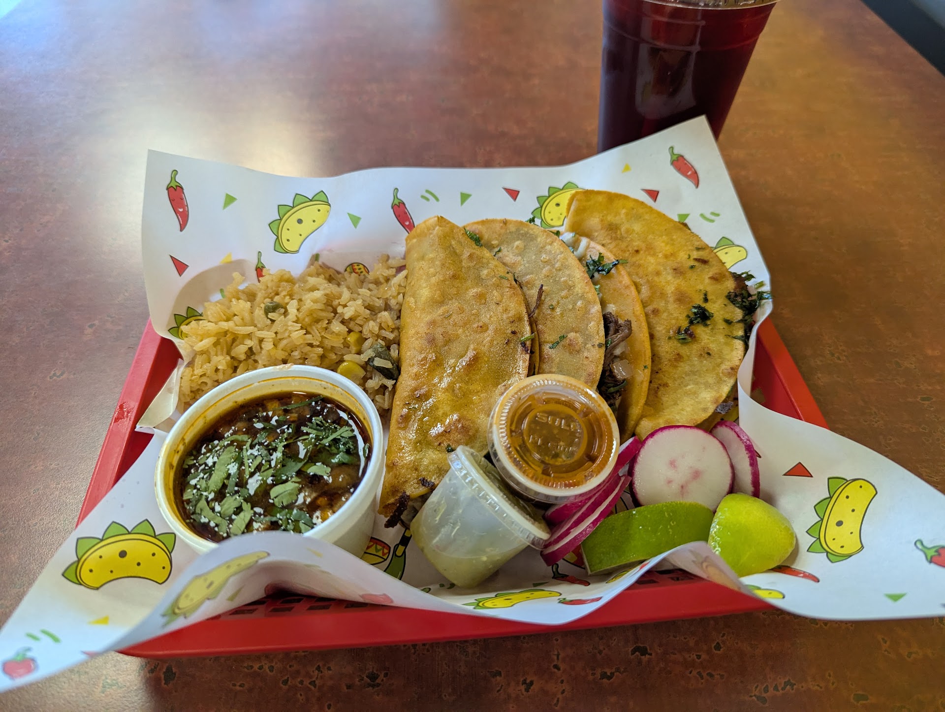 Read moreOur family ordered takeout online through Toast. Unfortunately our order was incorrect. Not a good first impression for a new and not busy restaurant. We ordered the dip flight for $10 which was supposed to include guacamole, salsa, and queso. We did not receive the guac (which was the main reason we ordered the flight) - instead we got a small container of refried beans, which was in addition to the side of refried beans that we'd ordered (the ordered side was $3.50 for three times the amount in the dip container.) So we basically paid $10 for a small amount of queso and salsa with chips. The tacos were ok. The barbacoa and birria tacos tasted essentially the same, and my barbacoa had a large chunk of fat. Our total was $65 for 6 tacos, a quesadilla, a side of beans, and chips with a small serving of queso and salsa. It seemed overpriced for what we received. We might consider trying this place again to taste a couple other menu items but will skip the...
