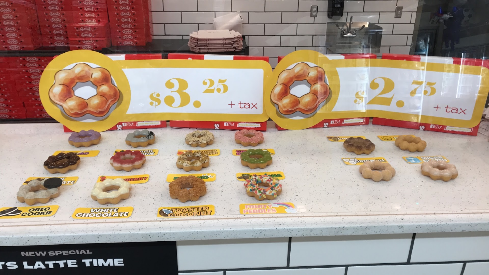 Overall rating for doughnuts: 2 stars , the frosting was disgusting, and they tasted as if they reused the oil. Flavors purchased ( strawberry, Lemon, Oreo cookie , fruity pebbles, glazed , and churros )