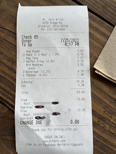 I recently went here on 11/23/20 around 8:30pm and ordered a 14" Hot Buttered Cheesesteak, 14" Romanburger with extra chz & 2 sides of funnel cake fries. There were 2 customers in front of me and one of them ordered 10 sandwiches so I ended up waiting over 30 minutes for my order. The wait although long didn't bother me because I love Mr Hero and used to work in the did industry so I understand what it is like to get swamped with orders ask at once but when I finally recieved my order it was completely wrong and not up to the usual standards. I recieved 3 7" cheesesteaks & 1 7" romanburger with 2 sides of funnel cakes that weren't even half full. The sandwiches themselves just weren't good period. I tried calling this establishment for 15 minutes and nobody would answer the phone and then I tried calling the next day figuring they were just still busy the night before only to be hung up on twice. Mistakes happen especially when it's busy but my order was a complete mess on every aspect and even worse trying to reach this establishment to vice my concerns seemed to be an even more difficult task. Needless to say I won't be going back here as I was breathing to a friend how good this mr hero was only for me to look foolish and then can't even get it corrected. Sad because I frequent different Mr Hero's often as it's one of my favorite fast food establishments but I won't be returning...