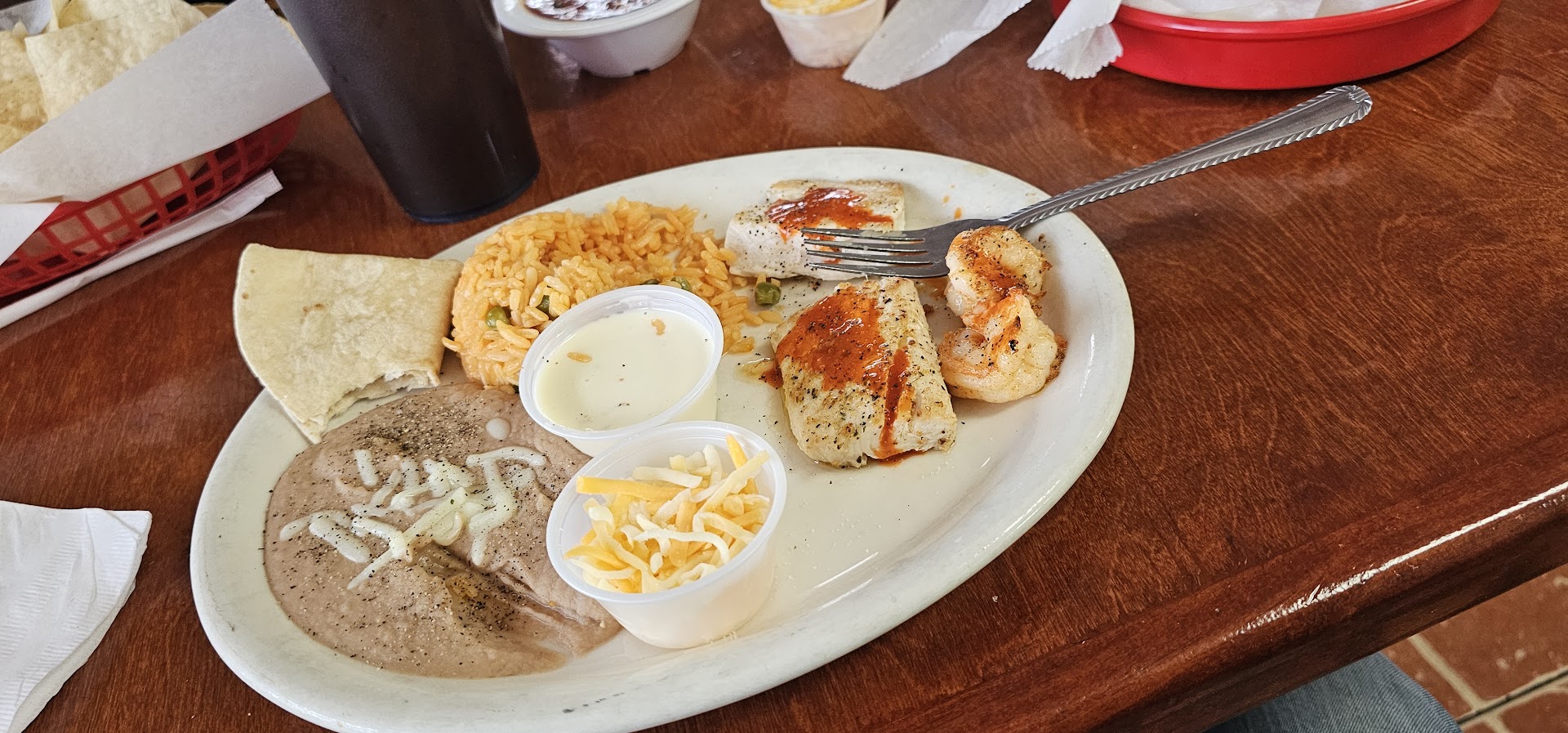 The soda beverages had to be returned to get something else the syrup must not have been mixed in well it was like pure syrup. There were four meals chosen one was a taco salad with ground beef one was a taco salad with chicken I had the chicken and steak fajita and my other friend had the three tacos and they put a sauce on them which was not cared for. The chicken taco salad came out with soup it was draining soggy up the plate with a liquid from the taco salad and there was not that much protein in the salad. The other taco salad again there was not much ground beef in that taco salad not very tasty and they really was not a lot of anything in those Taco salads for the size of the tortilla shell. They put a tomatillo sauce on top of those tacos which was the first time that's ever happened to them there this is not their first time dining there. And I had the chicken and steak fajita which was perfect.