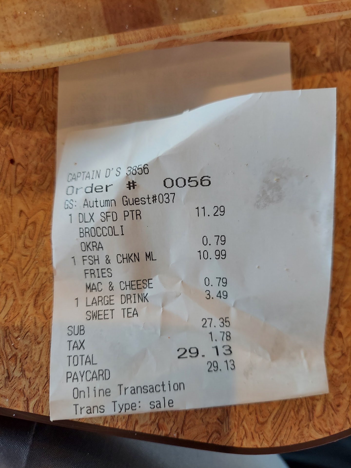 THE DAY CAPTAIN D'S OFF BROAD STREET BROOKSVILLE FLORIDA HAD FIRST OPENED UP WE ORDERED THE GRILLED SALMON DINNER AND THE CATFISH DINNER AND ON THAT ORDER WE WERE NOT UPCHARGED ON THE SIDE ITEMS AND THE GRILLED SALMON DINNER WAS GOOD AND THE CATFISH DINNER WAS GOOD!!!