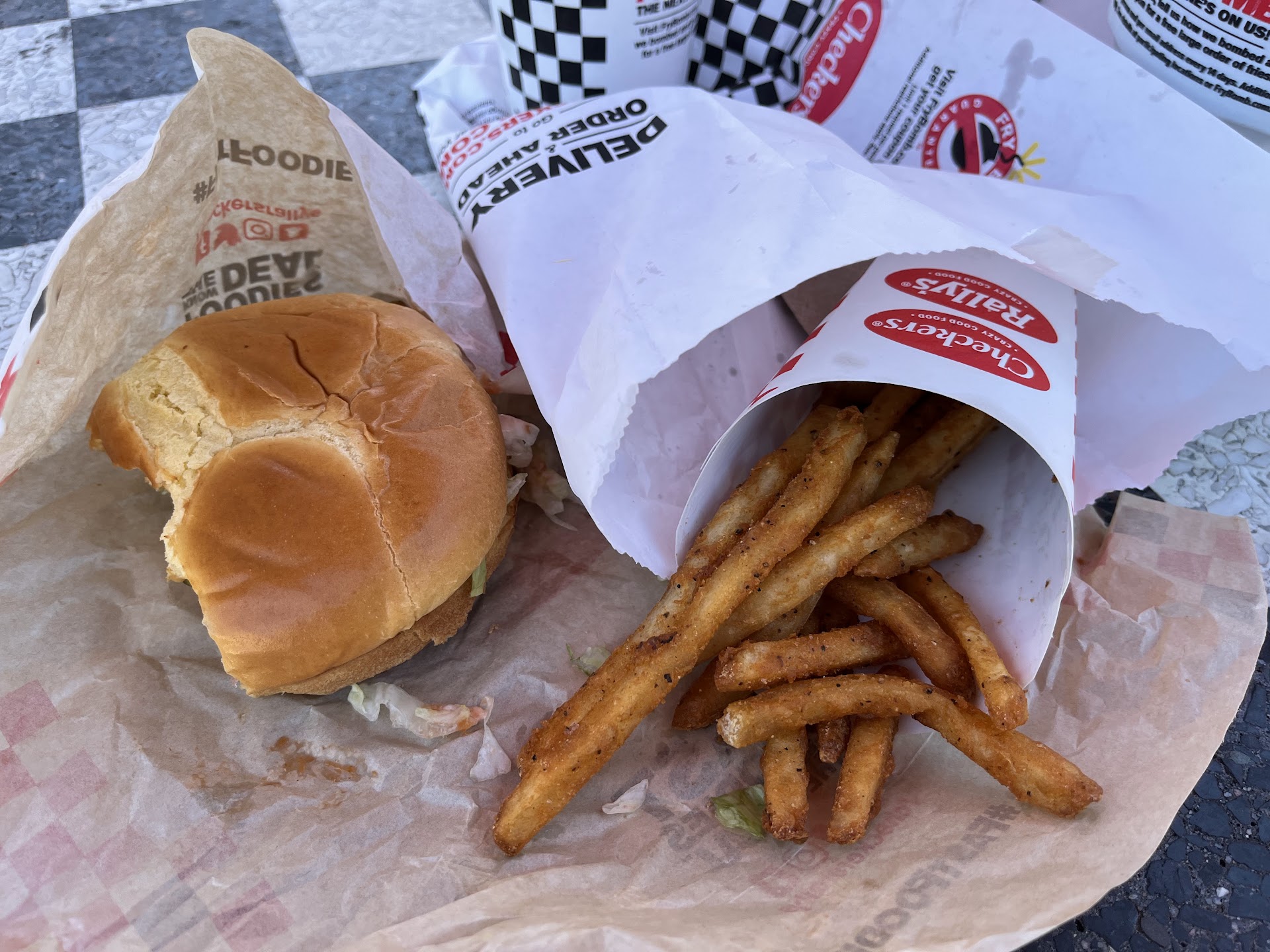 The service was okay, nothing outstanding that really wowed me to be honest. The food was nothing to write home about- normal fast food fare. The thing that was most concerning was that we were trying to have a nice little family dinner with the kids but the environment really wasn't appropriate for them. We thought it would be nice to sit outside with the picnic tables. Next door is an advanced auto and so guys were blasting really vulgar music while repairing whatever was wrong with their vehicles and then coming to hang out in the Checkers parking lot. One person even left their diesel truck running right next to the picnic tables- causing a lot of really gross smells and fumes while we were trying to eat. I know Checkers can't do anything about other patrons but I would say that families best just skip this location. Would probably be good for teenagers and college kids. Use the drive thru for...