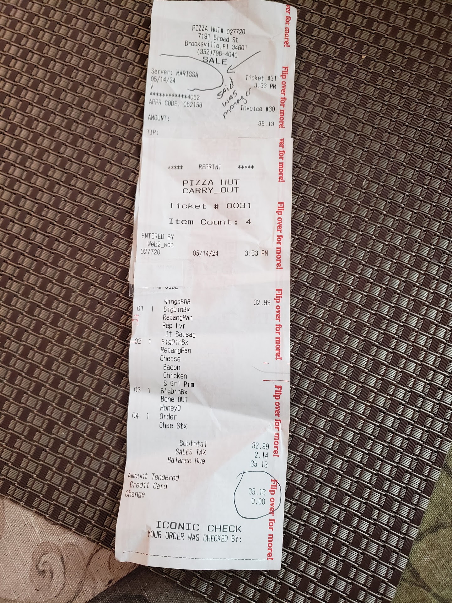 Read moreOrdered on the phone, asked for available specials and I agreed to go with the big box for 25.00. Was asked if I wanted boneless or regular wings and if I wanted cheese on the bread that came with the pizza.i asked if there was a difference in price and was told no so went with boneless and cheese. They gave me a total of 25 dollars and 20 minutes to pick up. I get there and my bill is 35 dollars. Apparently I added boneless and cheese to my order. Manager refuse to fix it, said they have an answering service and they are not responsible if the customer is quoted something different. She said she couldn't do anything. So I'm posting this for others, be prepared to be Scammed at the Hut !