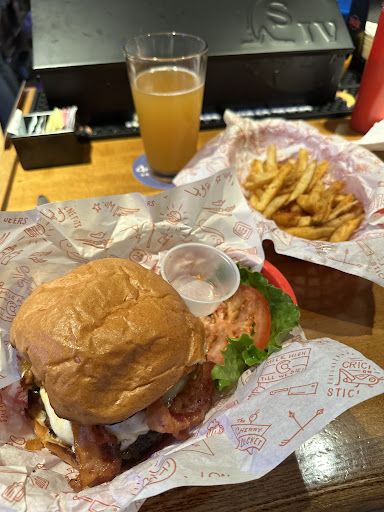 Went on opening day to Cherry Cricket in Broomfield. Was quickly greeted when I went inside and was told it’d be a 30-40 minute wait. I inquired about sitting at the bar, and fortunately for me there was one seat left at the end so I squeezed into it. After about five or so minutes I was greeted by Wade, one of the four bartenders. He took my drink order and I perused the menu before deciding on a cricket burger with pepper jack cheese, bacon jam, and bacon. Added a side of fries and said I’d like my burger cooked medium.