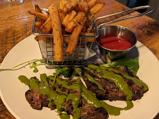 The long: My girlfriend and I had dinner here for the first time on Saturday night and we were impressed. At first we were seated in a table in the center of the room with wooden chairs (they were comfortable), but my girlfriend prefers the softer seating of a booth and asked if we could be moved to a half-booth on the other side of the room. The hostess checked with her manager whether she could split one of the tables at a half-booth, then did it and moved us over-- she was very congenial despite our special request. My girlfriend wasn't in the best spirits when we arrived and was a bit critical of the menu, saying she didn't see anything on it that she would want to eat. Bryce was our waiter and was a delight-- he was ridiculously friendly and helpful and had already started putting my girlfriend into a better mood about things. He asked if we had heard of this restaurant or its related restaurants and we hadn't-- he took a few minutes and told us, in detail, all about the various other restaurants started up by the same group... we were impressed with both his zeal and knowledge of his employer and their other business interests. I ordered the beet hummus and roasted cauliflower as appetizers, with plenty of special requests: I asked no nuts or pesto (contains nuts) on the beet hummus, and asked no raisins or nuts on the roasted cauliflower-- Bryce made sure to get the order just right. I ended up with a pint of draught porter and my girlfriend got a glass of cabernet... both were delicious... and in the meantime I ordered the hanger steak frites and my girlfriend ordered an appetizer-as-an-entree of some kind of balls made of fish meat (sorry, the name escapes me). The appetizers came in and Bryce came over to explain that with the pesto removed from the beet hummus, the chef had decided to replace it with some type of salsa that he felt would maintain the flavor profile of the dish... that's fine by me... one bite of the beet hummus and I was audibly moaning because it was so good and my girlfriend agreed. The roasted cauliflower was also very good, but would've been perfect if just drizzled with some garlic-infused olive oil before serving. The complimentary bread and butter tasted too good and we asked for more. Our meals came and the hanger steak with chimichurri sauce was the best hanger steak I've ever had-- and this is a dish I do order with some regularity (hanger steak is also known as a butcher's cut because it's such a tasty cut of meat that often butchers will keep it for themselves instead of selling it)... every bite was absolutely delectable. My girlfriend said the fish balls was the best fish she'd ever had and she likes fish. In the end, she said that this is her new favorite restaurant, even more so than the Black Cat down in Boulder. One key difference is that at the Black Cat we often have a hard time getting out of there for under $250. At Hickory & Ash, we paid $80. It felt like such a bargain and we will definitely be back. The entire experience was...