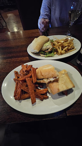 I started with a sangria, that was different than anticipated. I've always had red sangria, this was white and topped with apples and an orange slice. It was very refreshing! We decided on the fried pickle planks and they were fantastic!! A hot and crispy tempura style batter l, fried to perfection. The pickles were cut thin and length wise, which I believe is the best way to cut fried pickles. Served with a side of ranch and freshly salted they were some of the best fried pickles I've ever had. Next came the wedge salad. Another 10/10! The lettuce was fresh, the tomatoes were juicy and sweet. It was covered with a ton of homemade blue cheese deessing and crumbles with a drizzle of a balsamic glaze. Crispy and salty bacon finished it off. It was incredible. I was very pleased and extremely surprised! For dinner we had the bison Reuben w/ sweet potato fries, Burrata Ravioli with Lemon and Arugala and added chicken breast and a French dip. The Reuben was very well done. Packed full with bison pastrami and a perfect amount of Russian dressing and kraft. The sweet potato fries were hot and crispy. Thick and fluffy on the inside. They were really some great fries!! The ravioli dish was like nothing I've ever had. The creamy burritos filling with the acidic lemon sauce was very good. The arugula added a delightful texture and flavor as well. The only complaint the whole meal was the French dip. It was just extremely bland. The beef jad no flavor. The au jus was bland. The whole thing was just meh... unfortunately.