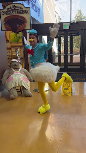 Just when I thought I’d seen it all, Rocky Mountain Chocolate Factory at Broomfield mall presented us with a scene straight out of a cartoon sketch. Mitch, a brave soul who lost a bet, walked in dressed in a Donald Duck costume so ridiculous, it stopped shoppers in their tracks. The ensemble was complete with bright yellow tights that hugged his legs, massive webbed feet that flopped with every step, and a white, fluffy bottom that shook with his every move.