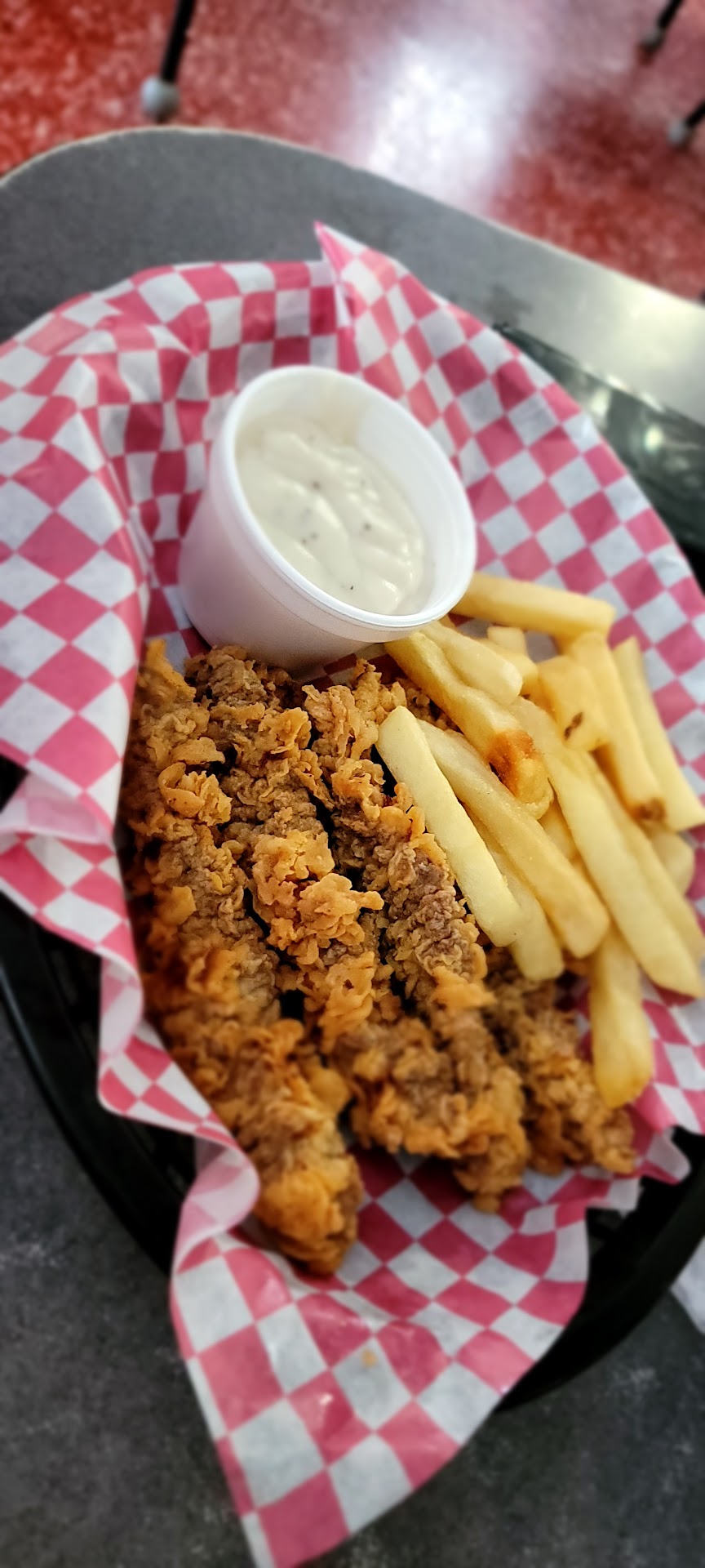 Dot's place did it right, couldn't eat it all. Big fat meat portions, even tasted great cold! That's the real test🤩 the beef tasted like grass fed beef! Really good. This was my 1st trip in; looked like kids running the place with moms in the kitchen cutting up fresh fixin's; young man was the cook and couple female younguns waiting the front. Nice, alert & friendly. Not much on aesthetics but good burgers. Oh yeah, big fat fries too with...