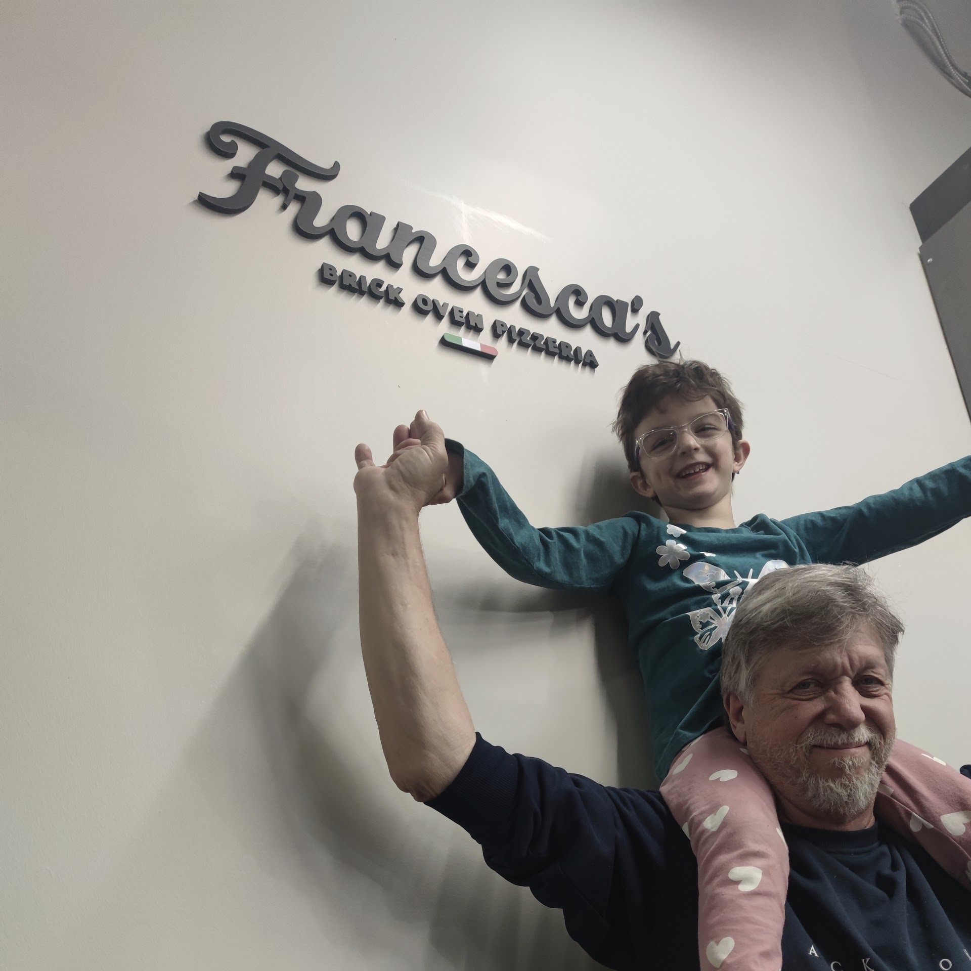 We were greeted and sat ourselves. We ordered and the pizza came out pretty fast. That was a pleasant surprise. Our server was also taking orders at the counter. She was super friendly. All the staff was. They came around to check often, offered us a house wine to sample. Always smiling but never in that super fake 'im smiling because we made eye contact way' they are genuinely happy to be serving.