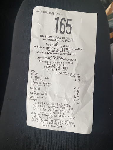 Read moreCame in to order, one fish fillet, double cheeseburger with tomato, cheese, Pickles and ketchup...i asked the cashier to have them freshly cook the fish, I get a fish that was dry, and cheese cold....I asked for a manager, I explained to het I wanted a fresh fillet she explains it would be 3 mins obviously the cooks took their time, manager running drive thru orders before .in got done in mind you 3 mins, 12 mins later, I get a soggy, cold cheese fillet you can tell fillet was old because of how the texture of the fish was not flaky normeat was not complete white, I took it back and asked for my money back.....dining area dirty, pop on floor, no condiments filled...the worst part is the cooks had no gloves on, I can assure you they were watching me from get go, I didn't have that fuzzy feeling my food was not puposely fouled, I shooed at least 5 flies from seating area....I seen a customer walk I with wrong order from drive thru...I think McDonald's is disgusting for allowing their crew members to work without gloves or hairnets on, as much sickness there is out in the world good way to spread it...I will never come into a McDonald's again, they're all the same...cashier's help with food after touching back and forth money...I would be happy to see changes made for the public instead of changes made to...