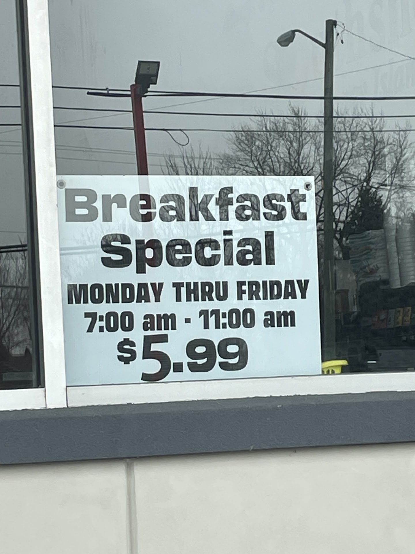 Meal Breakfast Special $3.25 with coffee $1.59. Total cost $5.13
