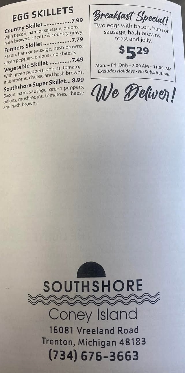 Atmosphere: South Shore Coney Island is located on the corner of Vreeland Road & Fort Street in Trenton, MI. They the typical layout of booths and tables throughout the restaurant and a small counter with seats at the entrance. There were quite a few overhead lights not working properly and accent lights above the tables were off so it made the restaurant very dim inside. I used a photo correction to add light to the pictures.