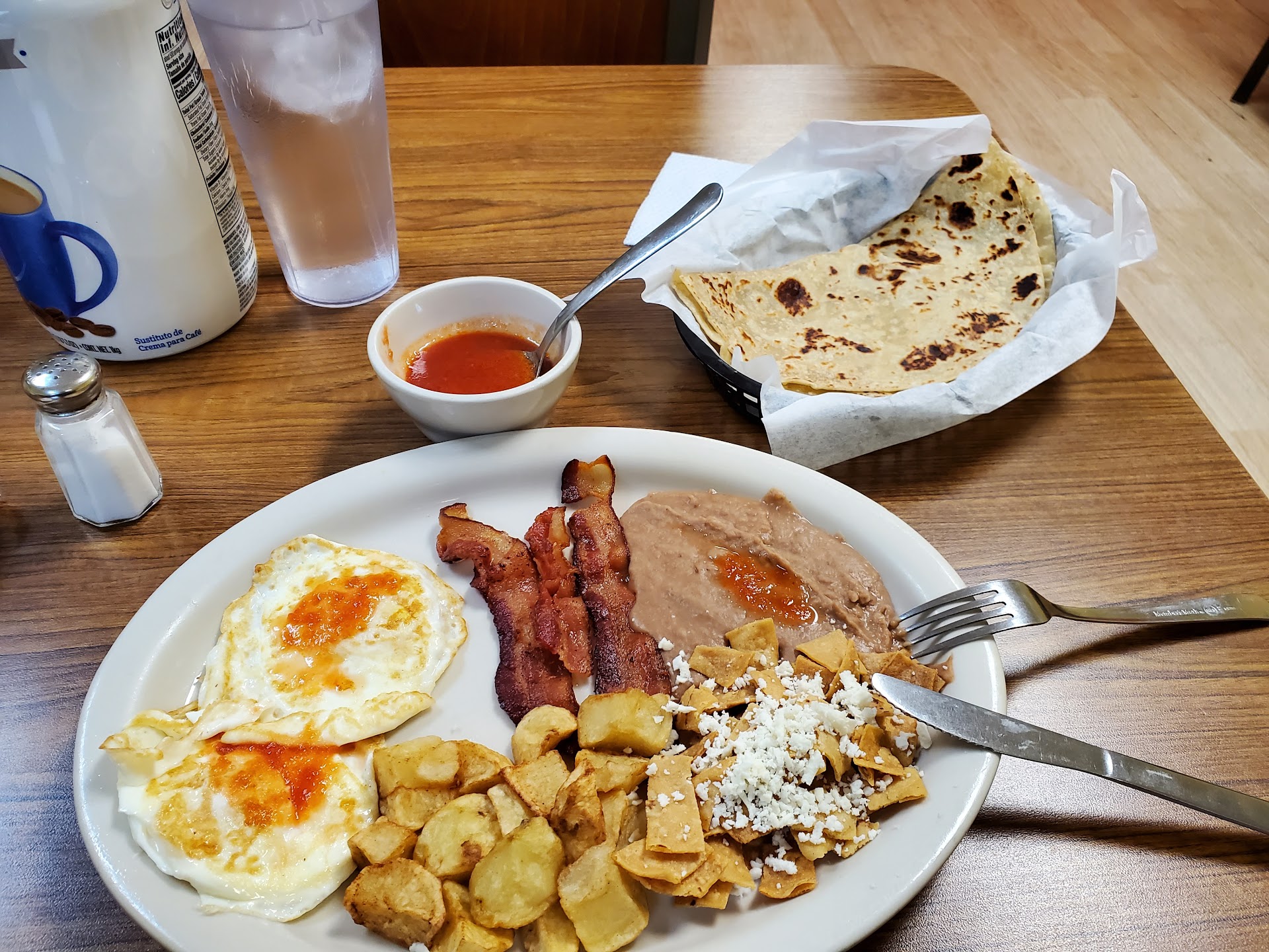 Was in the area saturday and gave them a try. $8.99 for Huevos rancheros was not a bad base price before I added two helpings of extra bacon. Coffee was good and didn't have any burnt taste to it. Waitress never let my coffee cup bottom out. More food than I was expecting for the price. I did add some of my chili pequin powder out of habit. The amount of food did catch me off guard. Now my mouth is watering writing this review. Was the first time I had cut up corn tortillia with cheese on it instead of rice. My bill came to around $16, I did add extra bacon, coffee, and Tea to go. Staff did so well I ended up leaving a $10 tip instead of the...