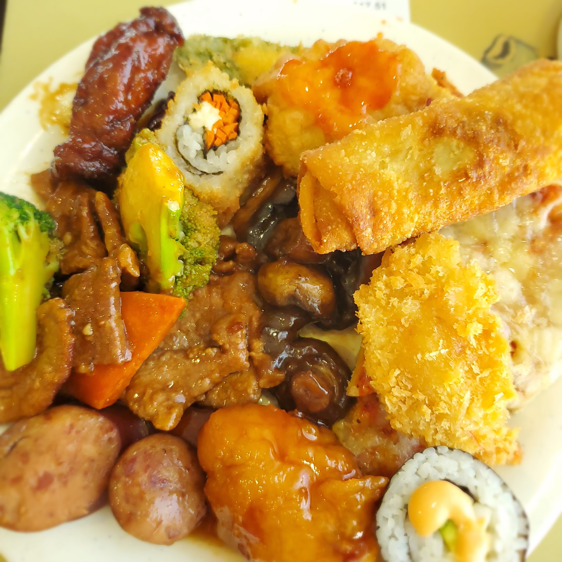 Read moreThe food looked great and all, but everything was cold. If it wasn't fully cold it was half cold. The warmest thing I had was the egg soup they have, and I'm saying WARM. Not hot. Ik they're not supposed to have it excruciatingly hot, but it could have at least been hotter then warm close to cold. Besides the food, the serves weren't very friendly. While the place was crowded, I'd run into some by accident and I'd say sorry and or excuse me and no acknowledgement what so ever. Same with the sever we had. She asked for our drinks, we said which we wanted and said please and thank you, no response. She would just walk away. Came back with the drinks, left them. We said thank you, again she just walked away. No response. The rest of the time just no acknowledgement from any waiters what so ever. The only friendly person we had today was the female cashier with dyed red hair. Another bright side to this story is that the fountain...
