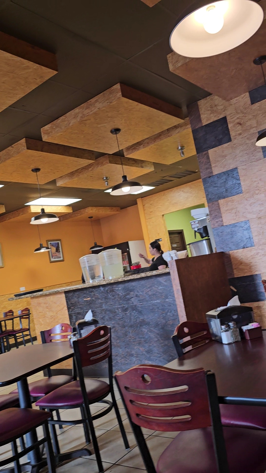 "The restaurant's ambiance, definitely gives off a café vibe, with its Mexican and French-style frames and subtle decor. Upon entering, we were greeted with a simple "Good morning, and welcome." I find that to be a sign of good manners and respect for customers. However, despite there being only one other table occupied by two women, it took a little while for a waitress to approach us with menus and take our drink order. Finally, after more than five minutes, a waitress came to take our drink order and provide menus. A further five minutes or so passed before we gave our food order, and she didn't return to offer coffee refills or check if we needed anything. She finally came back after our food was ready, which, to their credit, arrived in less than 15 minutes. After that, however, our waitress and the other servers seemed more preoccupied with a personal side conversation, and she didn't check on us until nearly ten minutes after we had finished eating. While she was nice and respectful, the customer service was not great. The food was good, with no complaints there, but the lack of attentive service definitely detracted from the experience. Although it wasn't a horrible experience, I can't say I truly enjoyed it or found it particularly pleasant. I wouldn't necessarily attribute the servers' behavior to the ownership or their training. Employees can have excellent training but still lack the necessary skills or attitude in practice. For that reason, I would be willing to give this restaurant a second chance. However, if my second experience were the same or worse, I would not return and certainly would not recommend this establishment to...