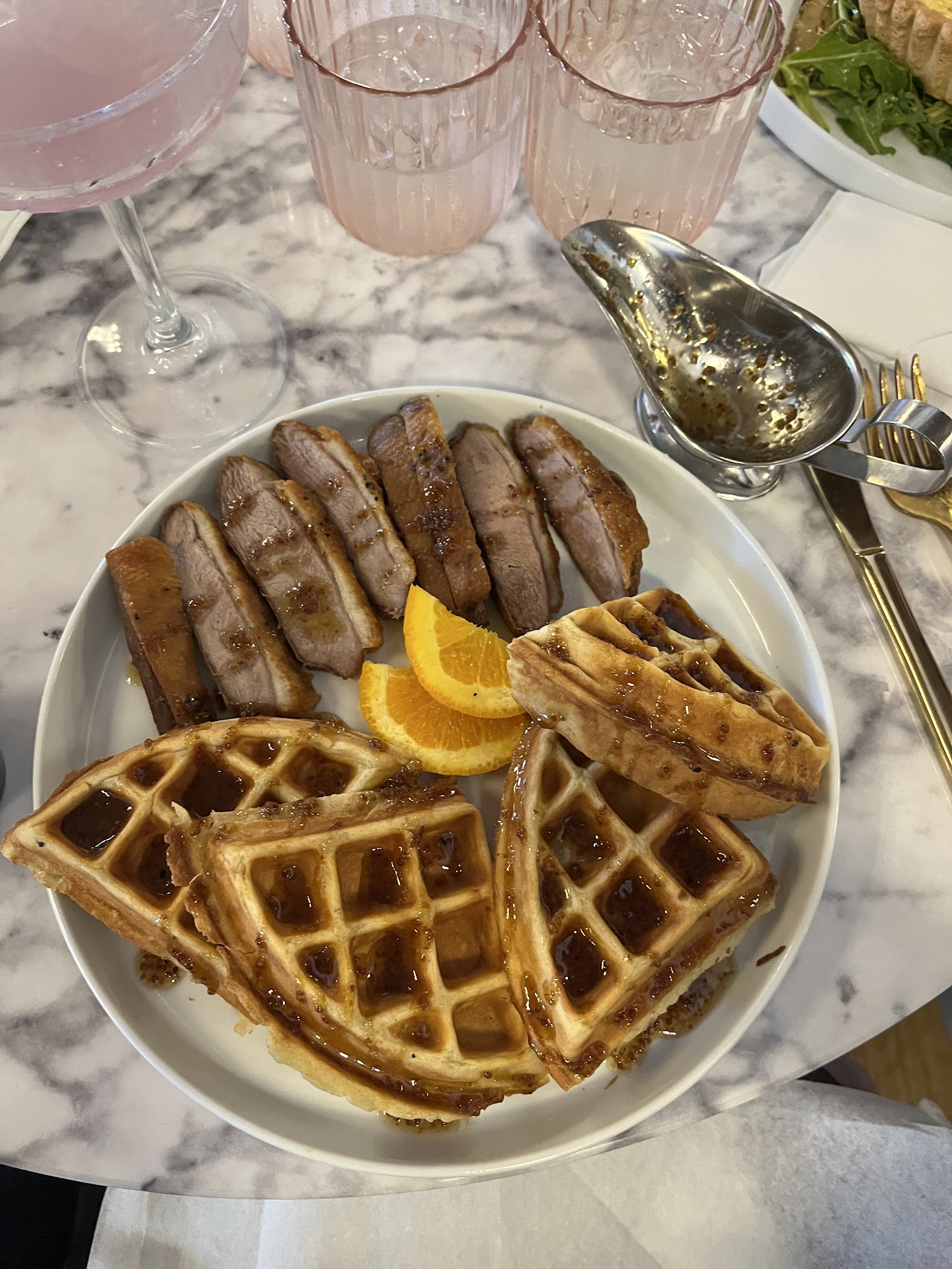 Read moreWe heard about this new place offering French cuisine and some other options so we thought we'd try something new. We are not from the Brownsville area, but knew we were going to be there yesterday so we made a reservation. Parking was challenging but I imagine anything located downtown has that same challenge. When we entered the building, though, it was quickly forgotten as we were immediately taken in by the look and feel of the restaurant. Charming is best word we could use to describe it. The brick columns with the hardwood ceiling and the unique chairs and colors gave the look of what we imagine a charming little restaurant in Paris might look like. As it turns out, the building is a historic building which made it all the more interesting. We were a large group, but we were tended to and served quickly. Our dishes ranged from the Salade De Campagne Francaise to the Poulet Croustillant. My husband loved the Quiche Lorraine and my parents and in-laws loved the Poulet Croustillant. The rest of us all had different plates and each of us loved what we ordered. The desserts were delicious and just the right size! The hardest part was choosing which ones to try! One of the other positives was that the pricing was fair. We did not feel any of the meals were overpriced. If I'm not mistaken, the most expensive item on the menu was the steak.