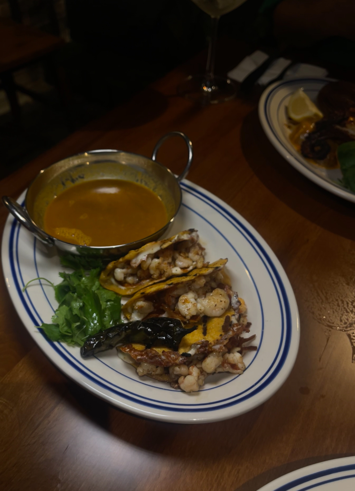 Unlike the usual starters of bread or chips and salsa, we were served a pita style flatbread with goat cheese and a peanut sauce, which was unique and savory. The cocktail I ordered was the Piña Brew, which was a take on a piña colada, but with cold brew coffee. I was skeptical as I was intrigued, but the coconut and pineapple flavors play nicely with the coffee. The Shrimp aguachile appetizer was very refreshing and flavorful, and presented very nicely. For my main course, I had the Baja Fish Tacos, which were unexpectedly unique and creative. The apple and jicama slaw was made with a mild curry sauce that elevated the tacos to something you won’t find anywhere else. The Sticky Toffee Pudding dessert was made with a date based cake, which was chewy on the edges and moist inside, and the house made whipped cream and whiskey caramel sauce were fantastic additions.