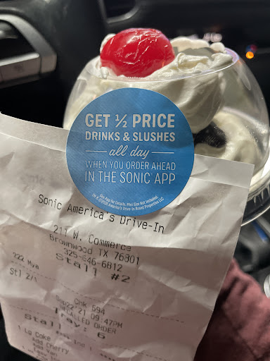 Read moreI go to Sonics all over central TX. And they are very hit and miss. This one has a habit of ignoring online orders and just doing what they want. Extra chocolate syrup? Nope, very light and barely mixed in. No ice in a 44oz drink? Ha, you get 32 Oz ice and 12 Oz drink. And ice cream machine not working? No refund but a swap for a rt44 lemonade - so $8 for two drinks that should have been $4, and are all ice. The other Brownwood location isn't much better most of the time. Made the mistake going back again.The lemon cream was totally unmixed.Nothing but lemon slush at the bottom and solid ice cream at the top.So fake that there's no way you can get it through a straw.Love Paying $6 for a drink that...