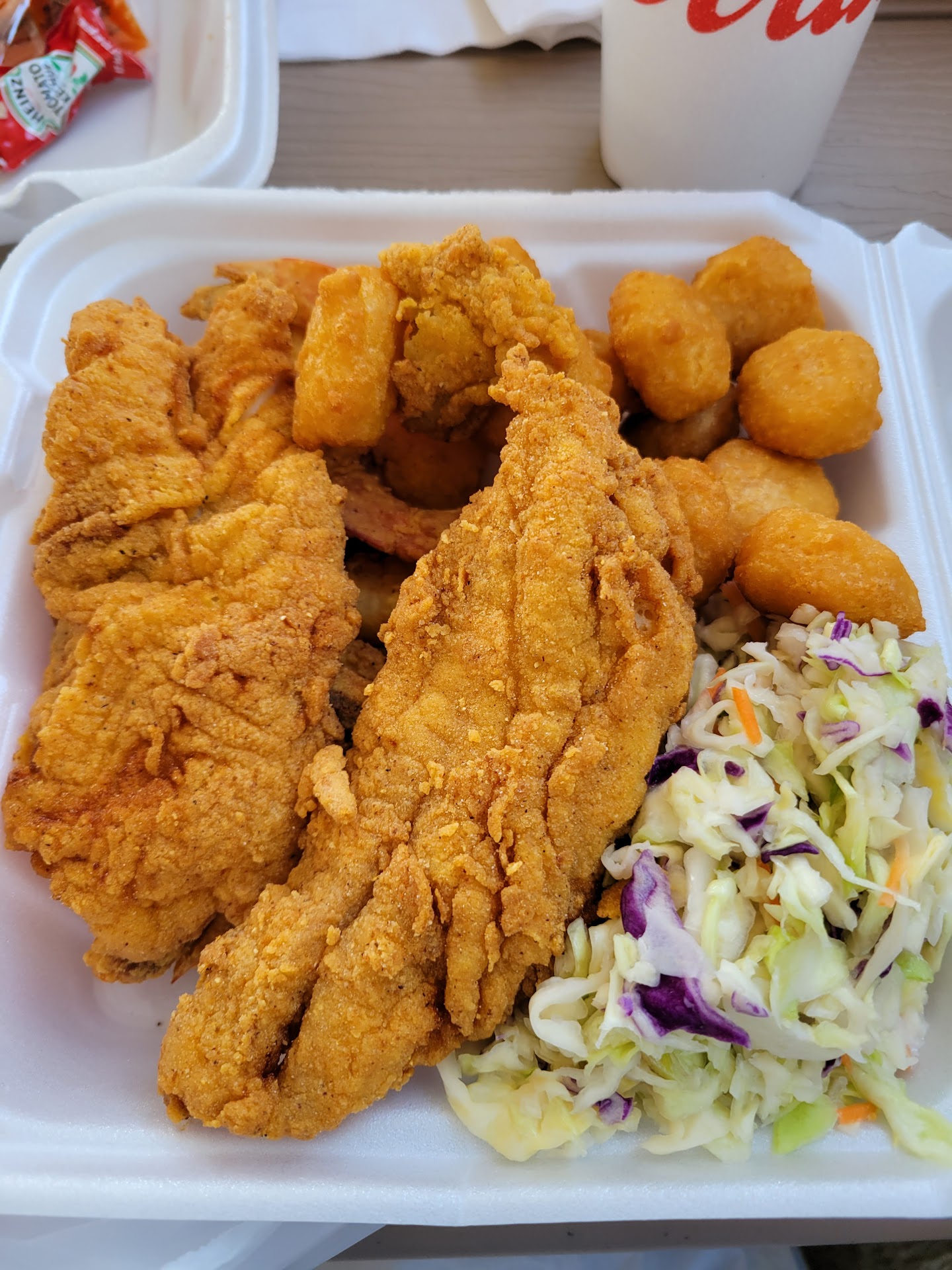 Read moreFat & Fine was the highest rated seafood restaurant that was open on President's Day and now I know why. The food was scrumptious and tasted like it was fresh off the boat. We had the fried fish (grouper) and shrimp combo with 2 sides and a beverage (Coke products) for $19.98 each. We also had a separate order of fried oysters for $9.98. Their available sides include slaw, corn nuggets, french fries, baked beans, egg, and sausage. Their specialty seems to be low country boil and crab. There is no dining room, but a covered area with a few picnic tables is located in front of the ordering area. With 2 humongous fans, the eating area seemed Covid safe. The restaurant is off Highway 17 in a residential area (the hood). They accept cash (includes a discount), credit, and EBT (non- fried food only). This is one of those hidden gems frequented by locals and coveted...