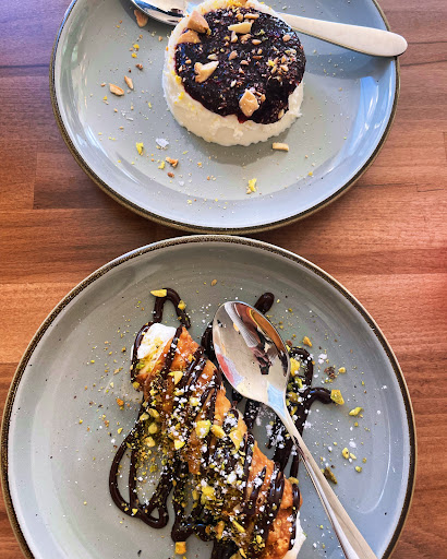 Two Cannolis , with chilled ricotta, pistachio, squiggle of hot fudge 😃👍🏼