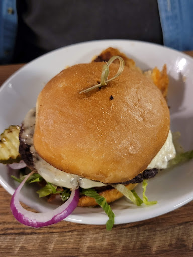 Food wise, it was pretty decent. We had the fish & chips and the juicy Lucy. They both came out fast and hot. The fish and chips portion size was quite large (we boxed half up for home) and the house made tartar sauce was very tasty. The fish was maybe a little bit under seasoned, but that was okay with the sauce. Fries were crispy for both meals. The burger was very large (8oz patty) and in fact a little oversized for the bun, which made eating it a bit of a challenge. The onions were nicely browned and tasty (not all the way to truly caramelized, which I'd say was preferable here), the lettuce was shredded, not a whole piece, which means it did wilt immediately (I like this on a burger but I know some do not). The patty was well seasoned and the white American cheese inside melted and in a well-distributed layer. Overall, it was good but honestly felt it was missing something from being great; I think an acidic/brightening element like a tomato jam or a brown onion relish instead of just browned onions could have elevated it to something memorable.