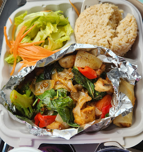 When I opened the box, I thought I was given the wrong food, because the drunken noodle had so few noodles in it it was like a vegetable dish. Where are the noodles!? After digging to the bottom, there was literally a single layer of noodles at the bottom, with all vegetables and tofu on top. Drunken Noodle is supposed to be spicy, but this was so spicy it was at least a 6 out a 7 out of ten, and I couldn't eat it. The salad was just chopped up romaine lettuce with a yellow, very sweet sauce on it. The drunken noodle was served in a small foil dish inside the takeout container. When I lifted up the small foil dish, there was so much oil on the bottom of the takeout container, I couldn't believe it. Oil literally poured out of the foil dish when I lifted it up.