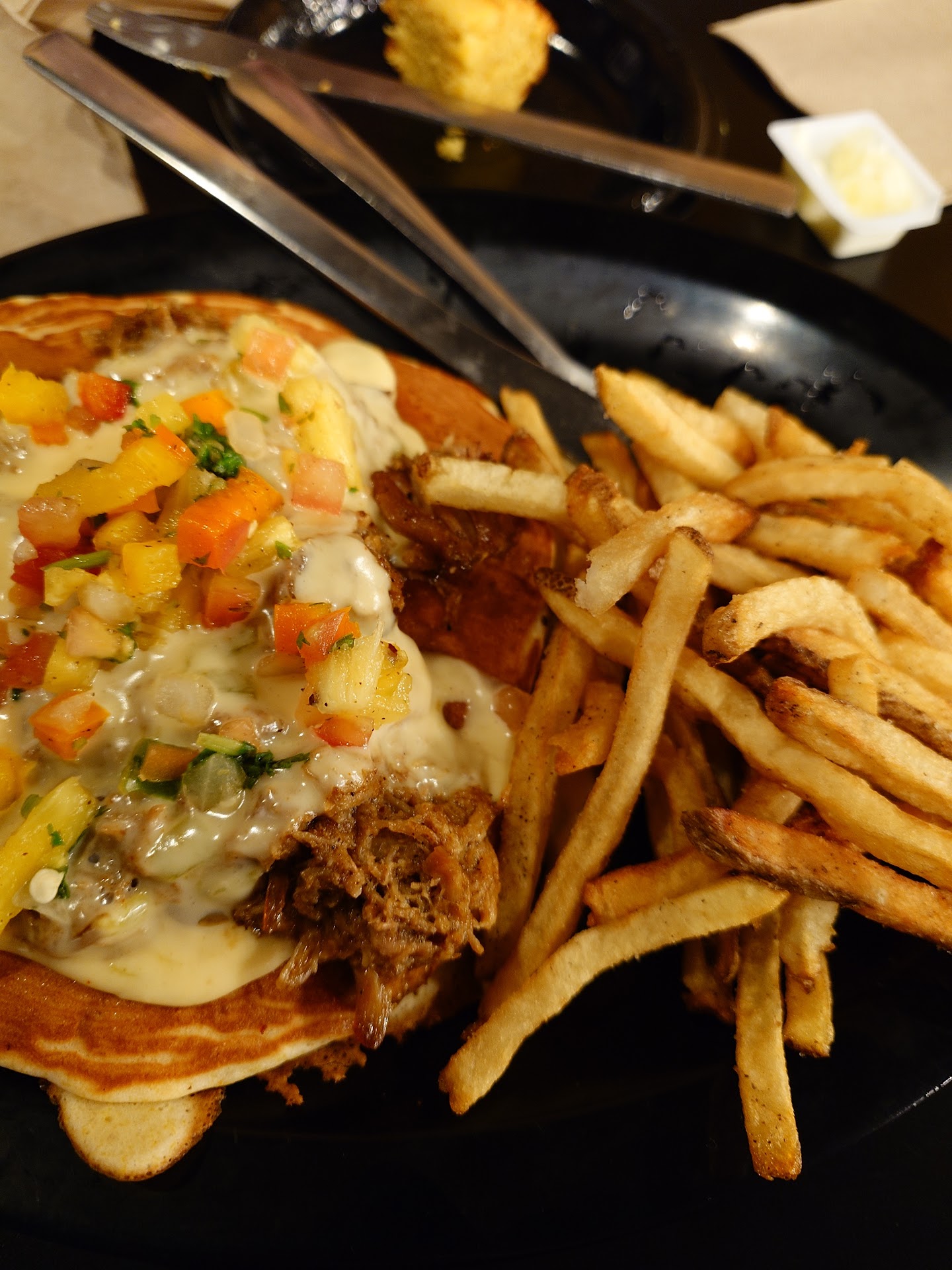 Service: Immediately upon entering, we were greeted by two people and asked if they could be of any assistance. While looking over the menu my fiance had some questions and the cashier was able to answer all her questions. When it came to my decision, I asked about The Morning After, being hesitant about the cornbread pancakes in the meal, a server that was nearby said although they were different they were savory and that it was highly recommended.