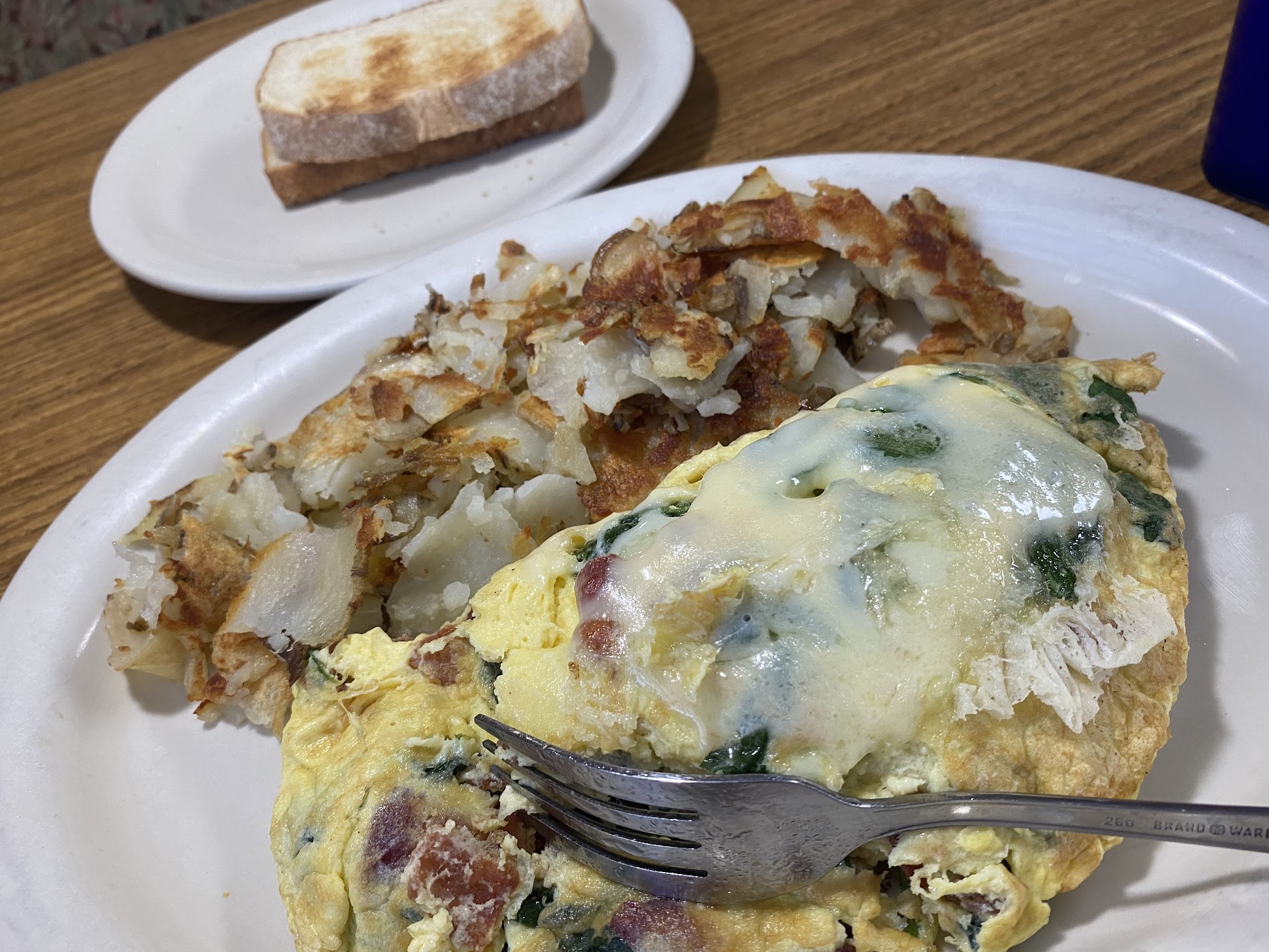 Our server didn’t introduce herself. I assumed she was new to serving so I cut her a lot of slack. She brought us our drinks promptly, but she seemed sort of out of it. It wasn’t very busy, just steady flow of customers... but to me she seemed to act overwhelmed. In short, she took my family’s order, and we spoke slowly and clearly, but still had to repeat the order. I’m guessing she hasn’t mastered shorthand to take orders on a pen pad. Our food came out quickly, brought by a different server. We were not checked on by our assigned server again the entire evening. She stayed at the cash register. I flagged down the other server to let her know that my salad and my husband’s toast was forgotten, but she graciously assisted and she wasn’t the one who took our order anyway so we were grateful she stepped up.
